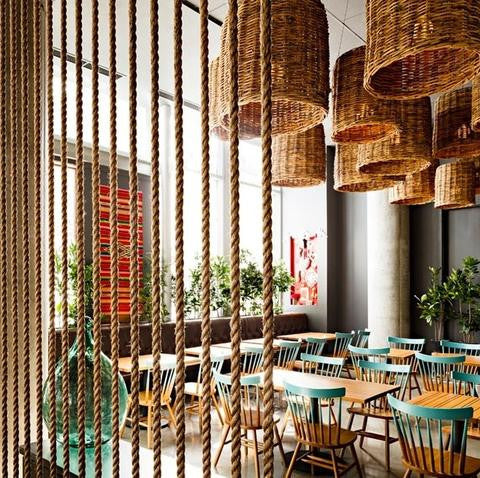 As these two restaurants show, old-style rattan and cane pendant lights don’t look outdated when you put some thought into their placement. They look beautiful hung at various heights in the trees, or grouped together at the centre of a large space.