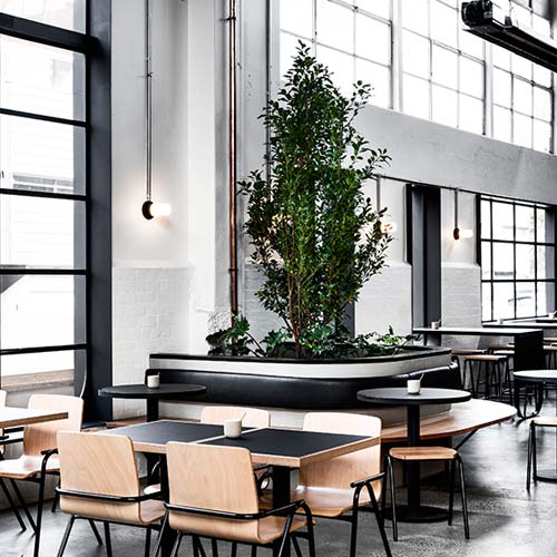 Techne Architecture and Interior Design reshaped the Veneziano Café to encourage open space interactions with customers. The open-air location is fitted with concrete walls that have been finished with our designer wall lights, found only here at Fat Shack Vintage. The Bunker Tube Wall Light oozes industrial flair and gives the Veneziano Café a modern-luxe feel and style.