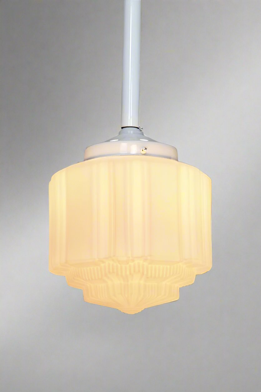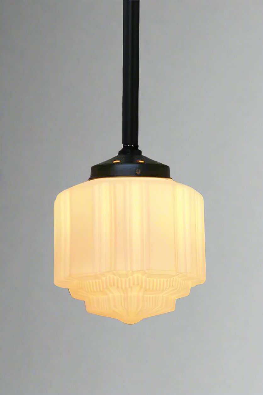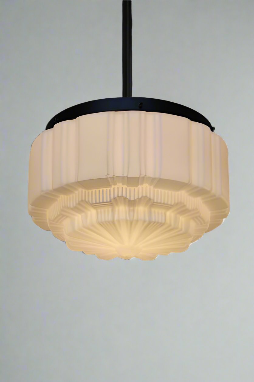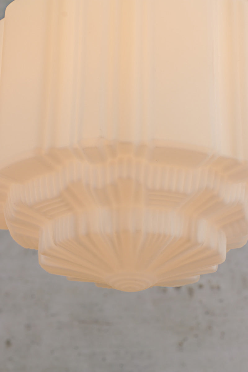 Bring art deco flair into your home or commercial fit-out with the Deco Glass Ceiling Pendant Light. Its pressed opal glass shade comes in two shade sizes and pairs with various suspension options to offer timeless appeal that can be incorporated into any contemporary or traditional room. Add period drama to your dining room, lounge or bedroom with the stunning geometric style of this pendant. Commercially, this light would add the final art deco touch to your vintage speakeasy, luxe hotel bar or intimate restaurant.