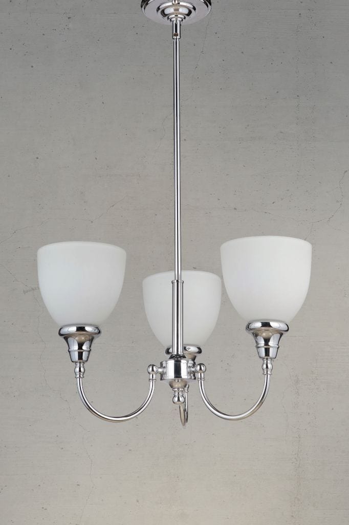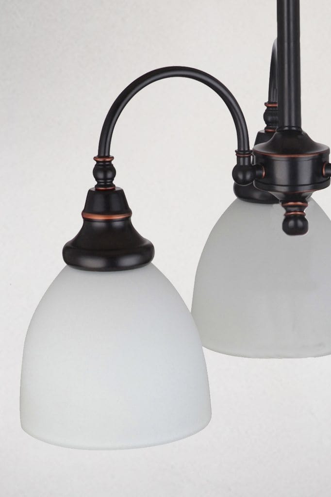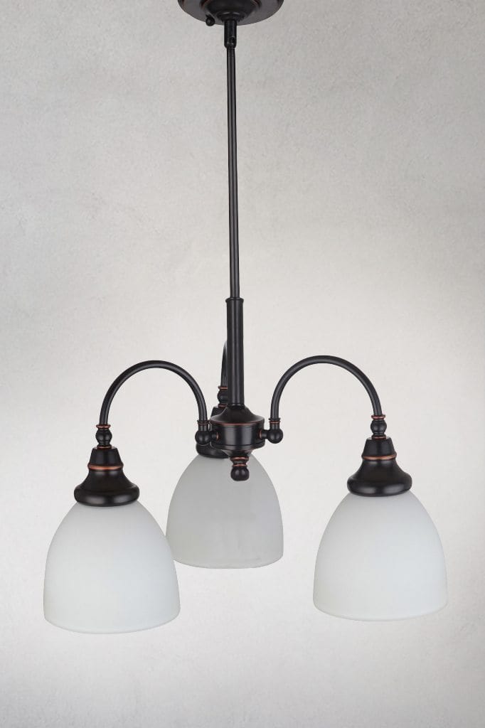 - This chandelier is comprised of a metal frame finished in bronze, chrome or stain brass, frosted glass shades and a metal suspension rod.
