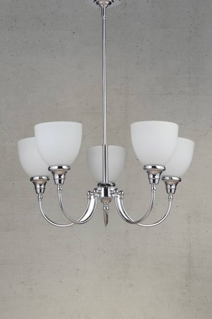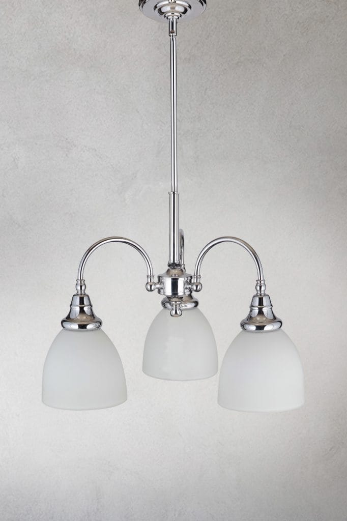 The Albany Downright Glass adds classical elegance to your space. Curved metal arms in three finishes hold the frosted glass shades in either upright or downward facing options. Both are supported by a central suspension rod. This chandelier is available in two sizes and styles, and adds a traditional aesthetic to your dining room, bedroom or lounge. Commercially, this light would suit an elegant bridal salon, Hamptons style lodge or sophisticated tearoom.