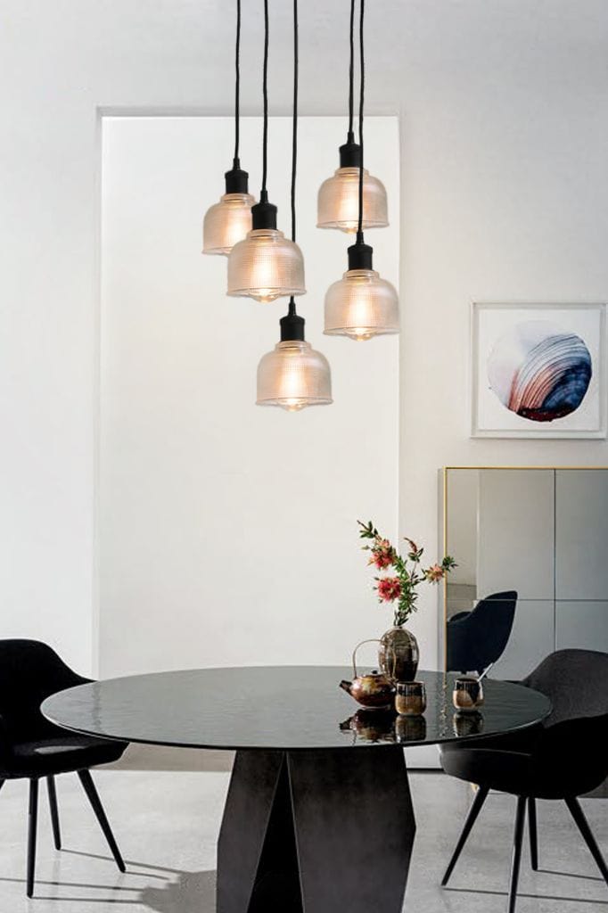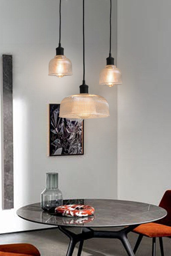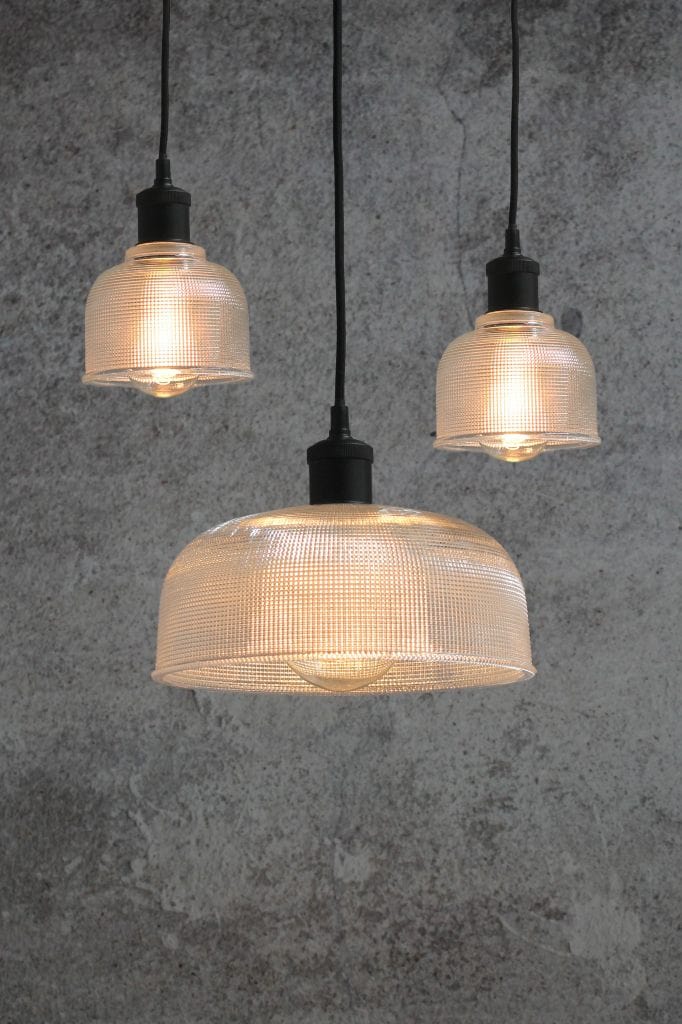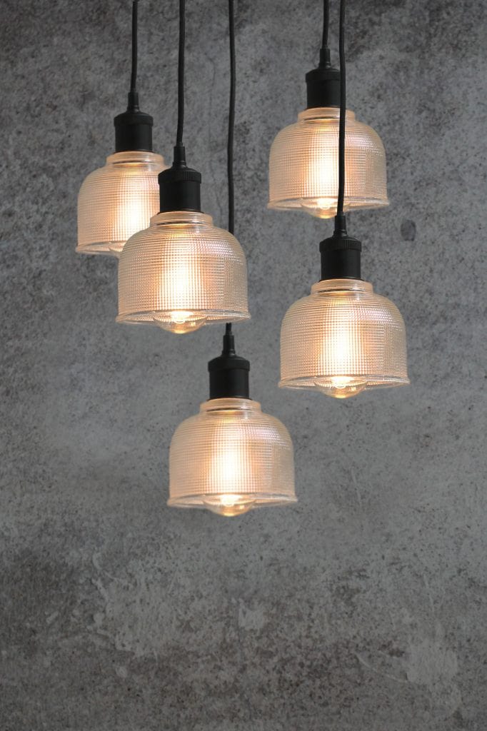 Bring dynamic, vintage flair to any room with the Chapman Multi Drop Pendant Light. This light is available in a three or five light variant with adjustable cord lengths for a multitude of styles. This light features holophane glass with a crosshatch pattern, inspired by popular holophane light fittings from the early 1900s. The shades diffuse light, making them suitable for mood lighting, and would be perfect to add style to a classic style restaurant or a master bedroom.