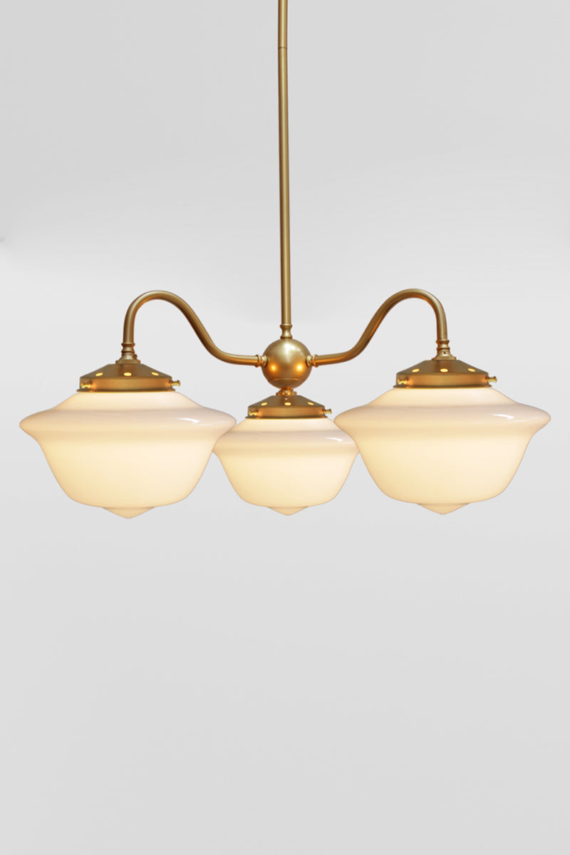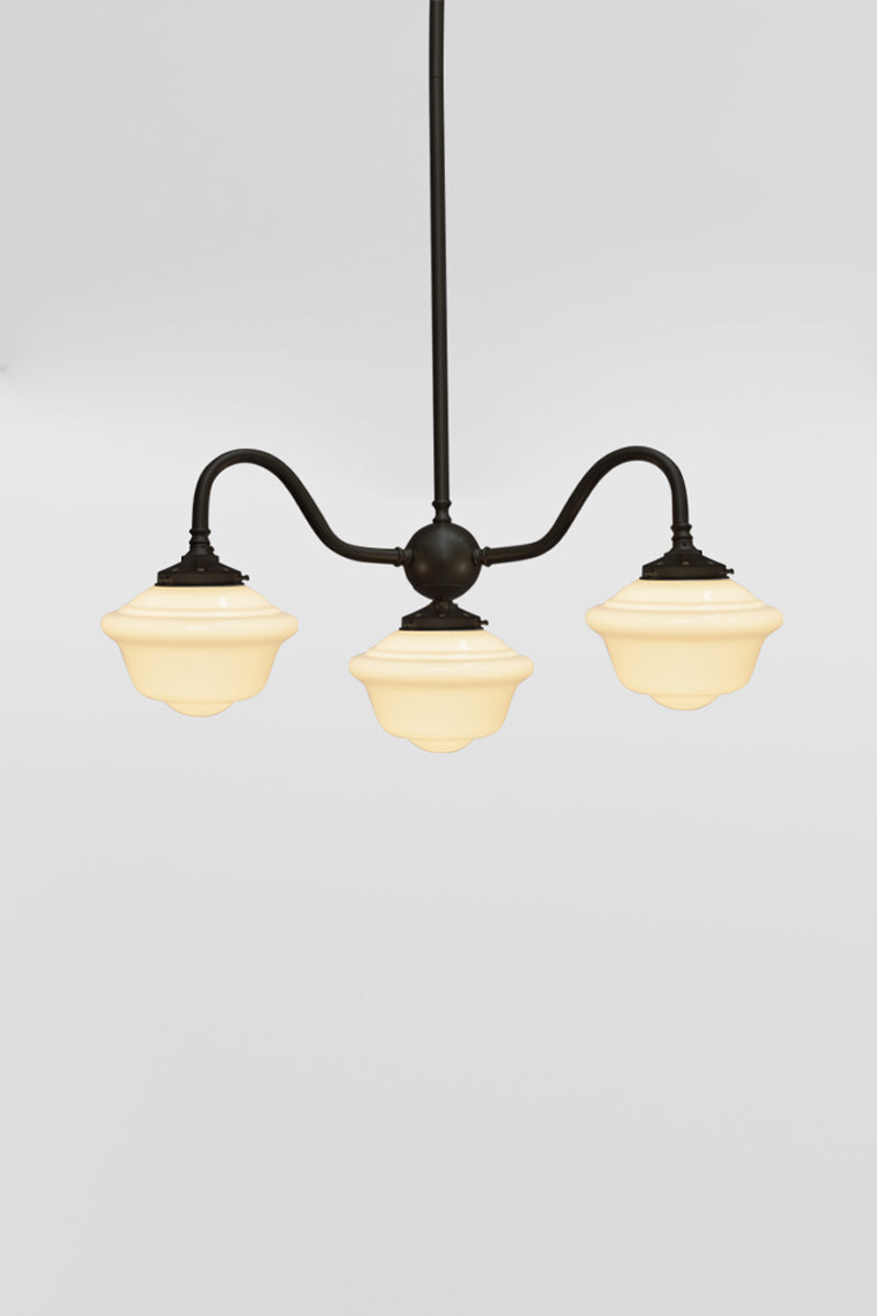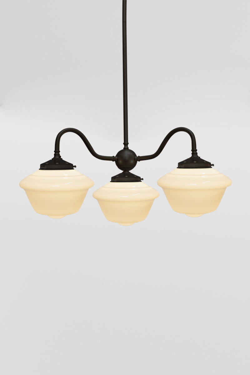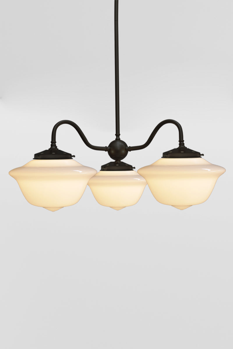 Step back in time with the Chelsea Gooseneck Chandelier. This chandelier has gooseneck frames available in a matt black handmade brass option and two steel finished options. The shades have been created from handmade milky opal glass and are a testament to timeless design. Evoking the nostalgic charm of schoolhouse lighting of the 1900s, this heritage lighting is ideal for dining rooms, ballrooms and fine dining restaurants.