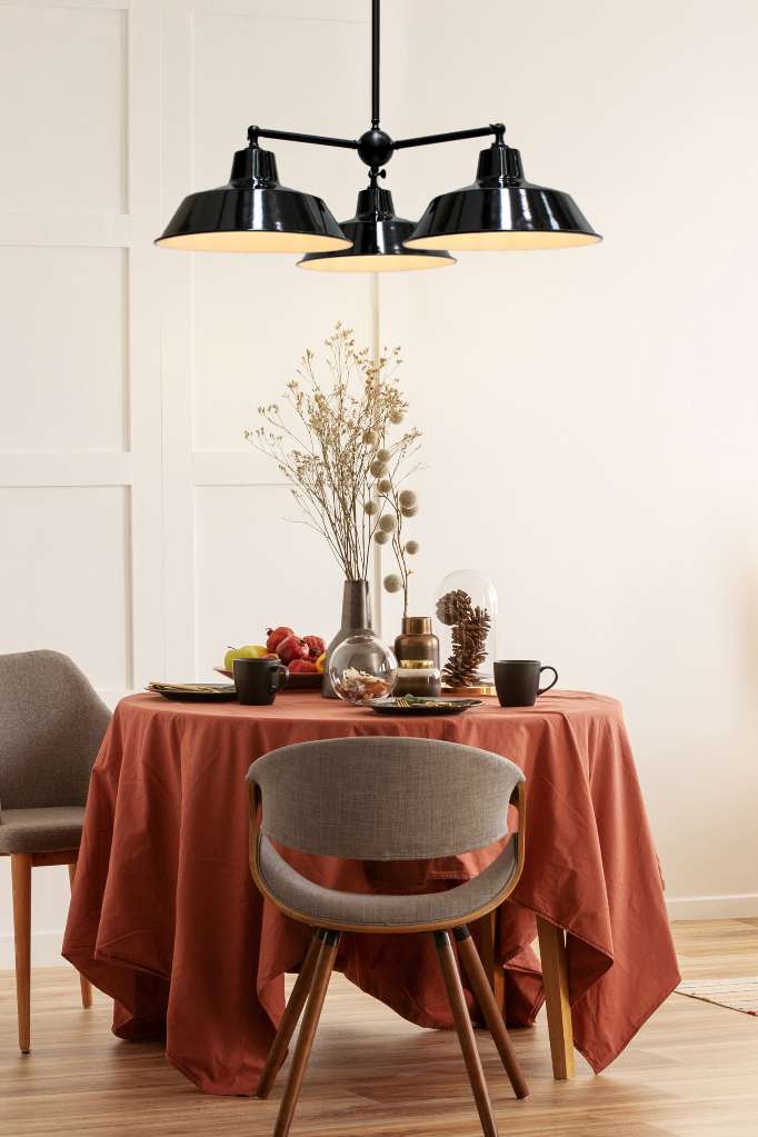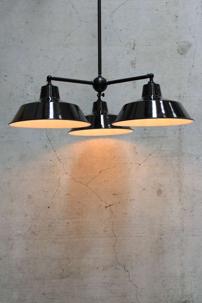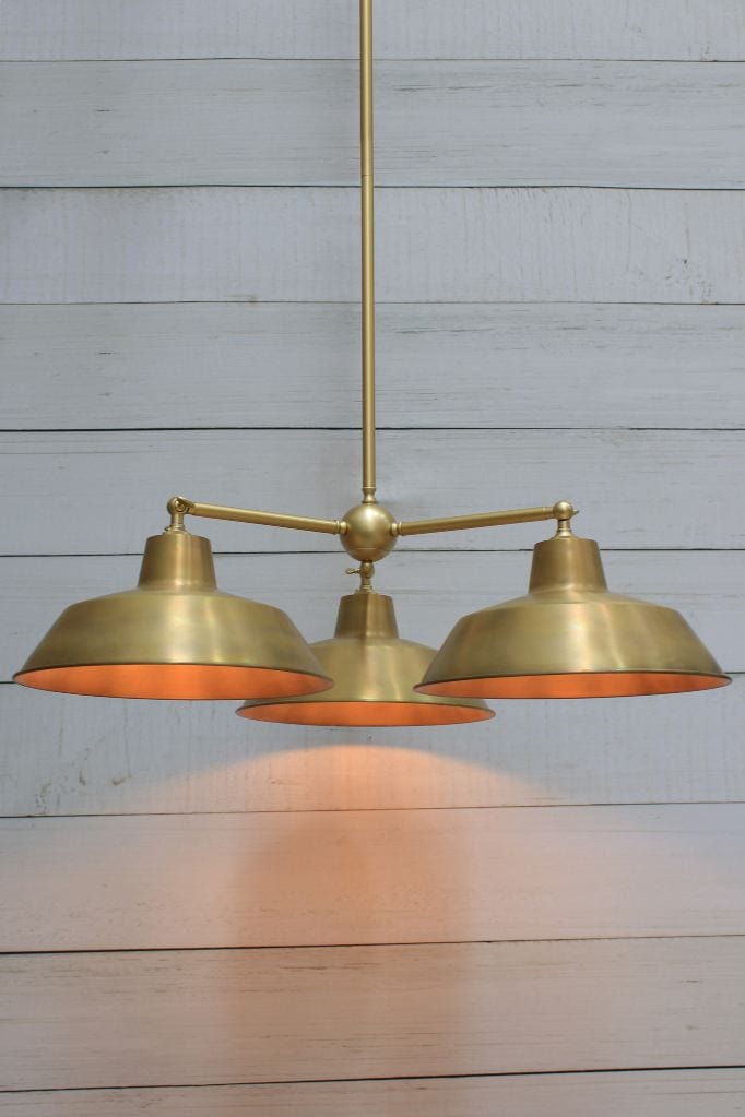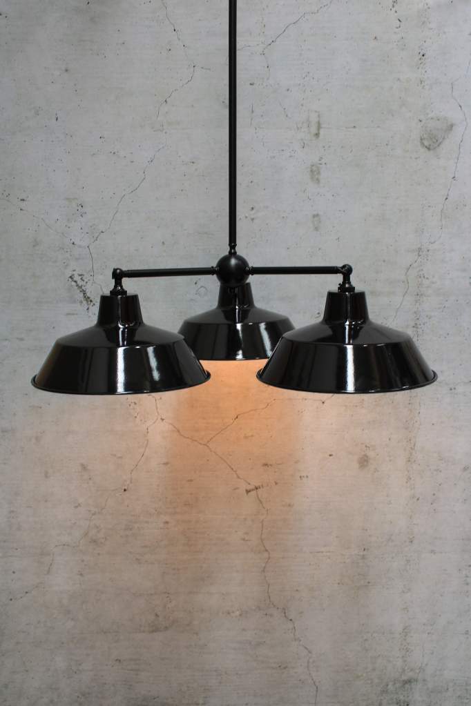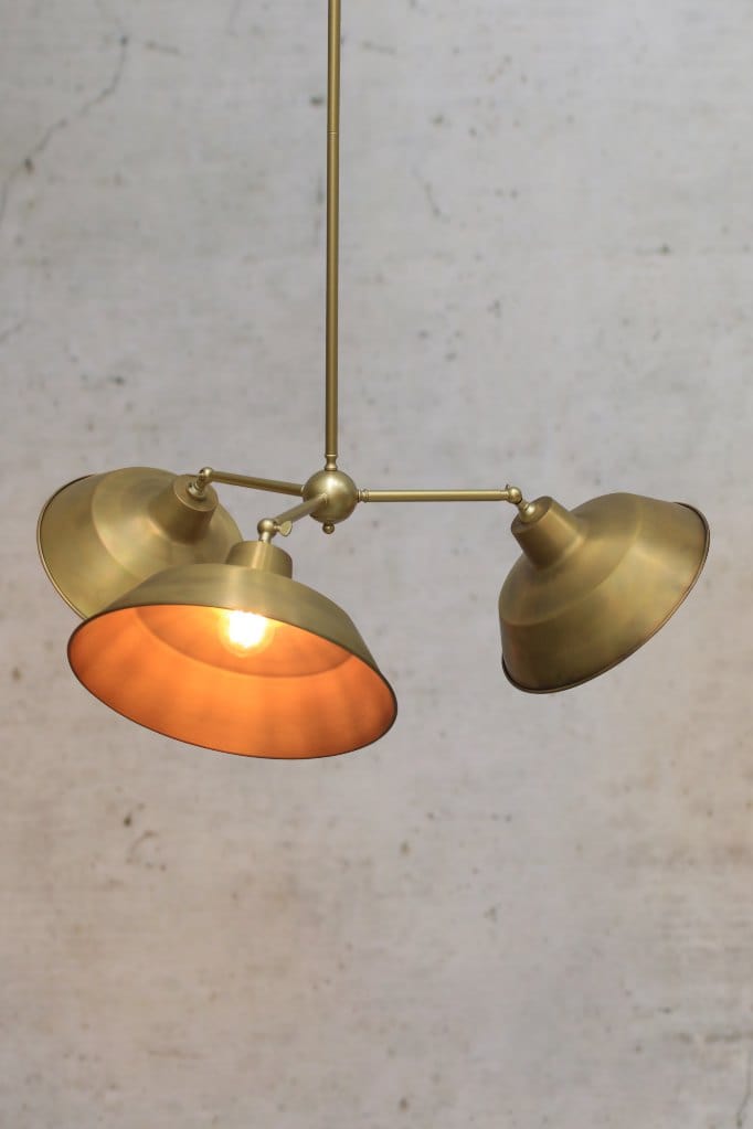 Bring practical style to any room with the Factory Chandelier. Made with high quality steel, the three-arm frame comes in either Black or Gold/Brass finishes. The frames feature adjustable arms using wingnut screws on the ends for 180 degrees of vertical range for the shades. The shades come in your choice of eight finishes in brass, copper or steel bases with an optional black cage for a more striking design. Popular above dining tables, kitchens or in any urban eatery.