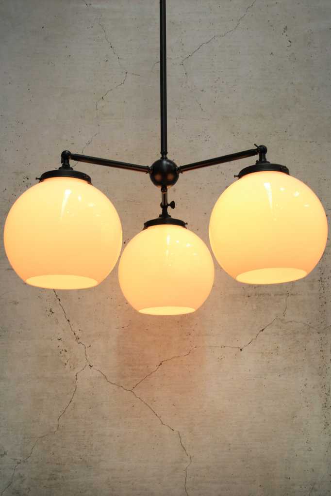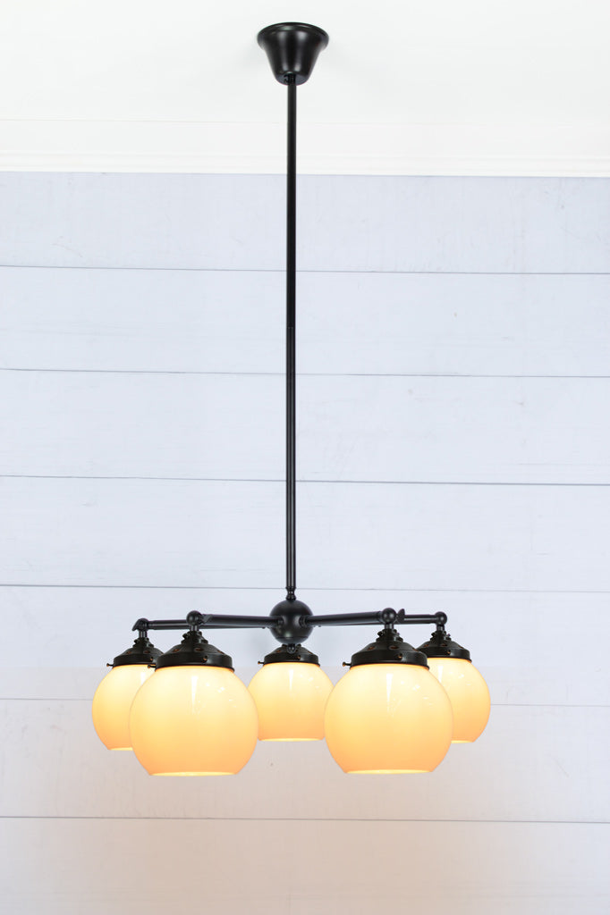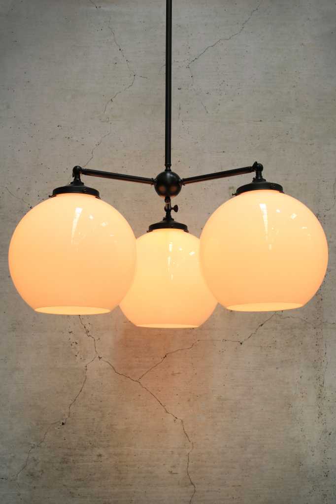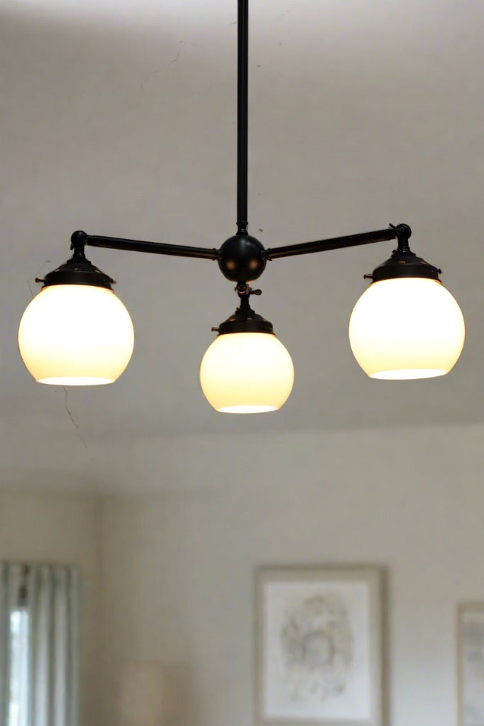 Add a mix of classic vintage elegance with industrial flair to your space with the Michigan Open Glass Chandelier. This multi light pendant is available in a triple arm fixture in quality steel with a black or gold/brass finish. The five arm fixture is available in black steel only and is paired with the small or medium shades. Showcasing an opal glass shade with an open end, it diffuses light to produce an inviting glow. The blown glass shades come in three different sizes, all of which exude timeless appeal.