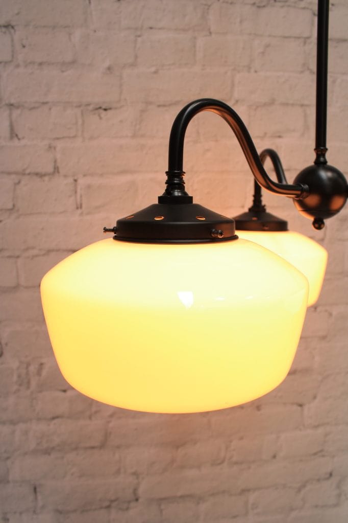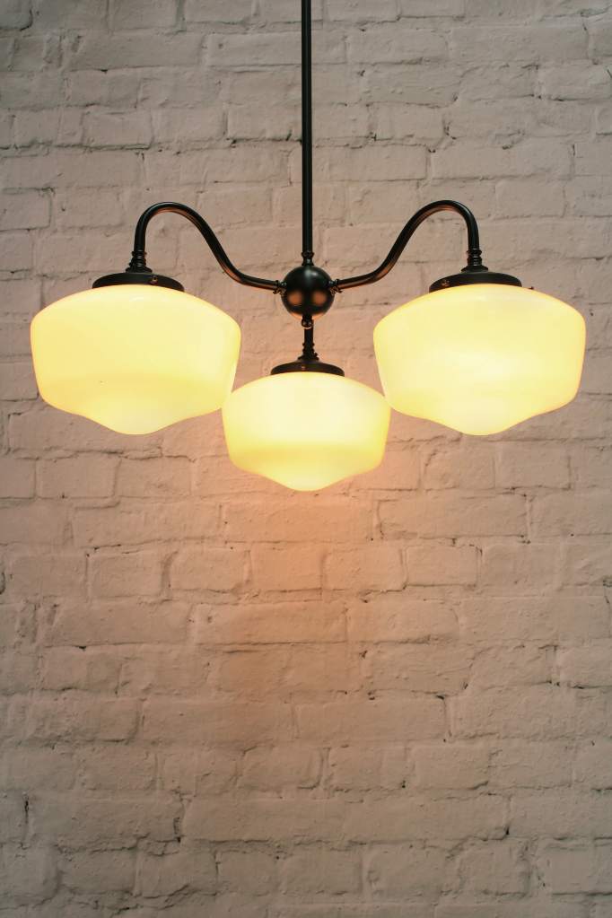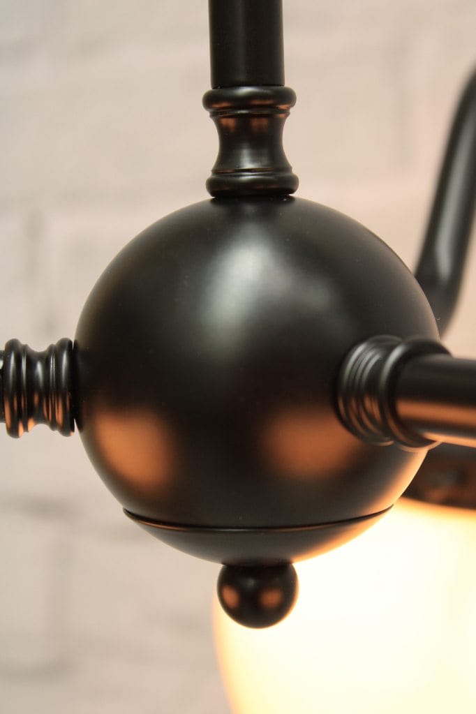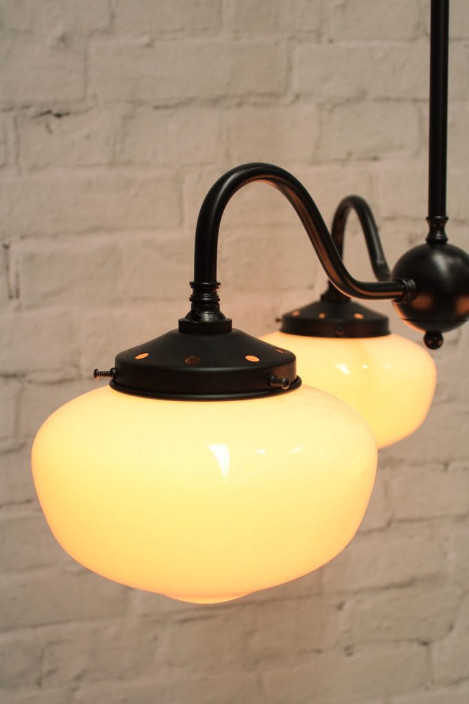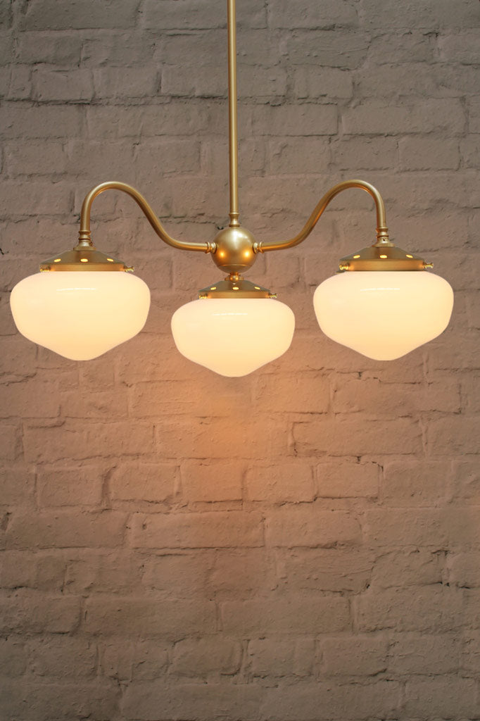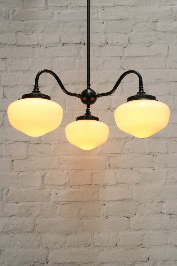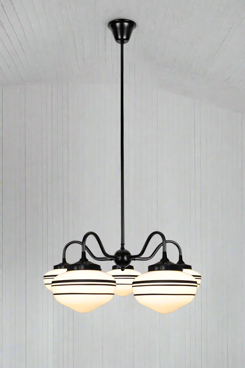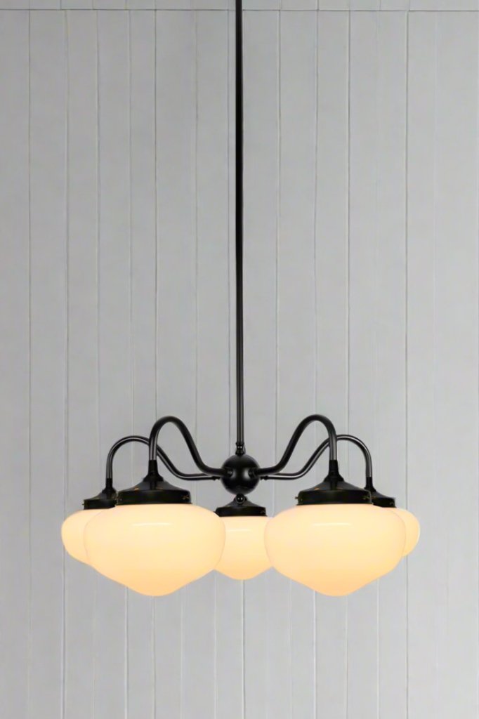 The Washington Gooseneck Chandelier brings a dose of old world charm to your living spaces. Emphasising its authentic flair are three handblown opal glass shades that reflect the 1920s schoolhouse style of yesteryear. The shades come in two size options to suit your space and the small size includes optional hand painted stripe styles for added character. Made-to-order by artisan craftsmanship, its high quality brass metal fixture features three gooseneck arms and comes in a Matt Black finish. This light is also available with our steel frame options, in 3 or 5 arm in Black or 3 arm in Gold/Brass finishes. This pendant makes a timeless statement in any interior and is ideal as a centrepiece for restaurants, venues, living rooms and dining spaces.