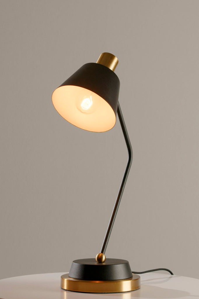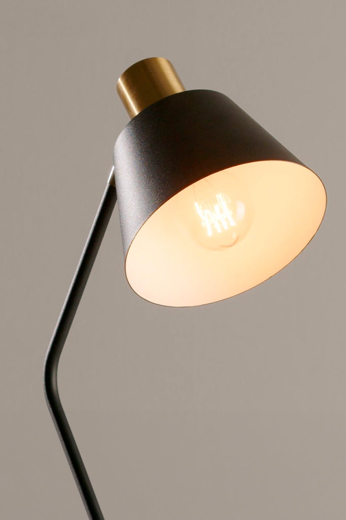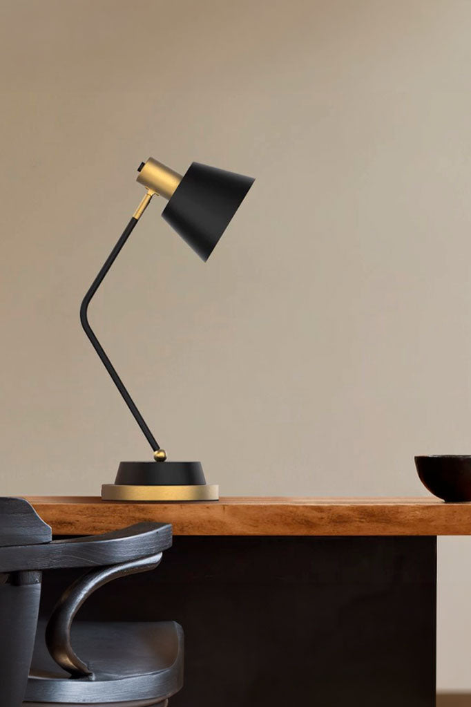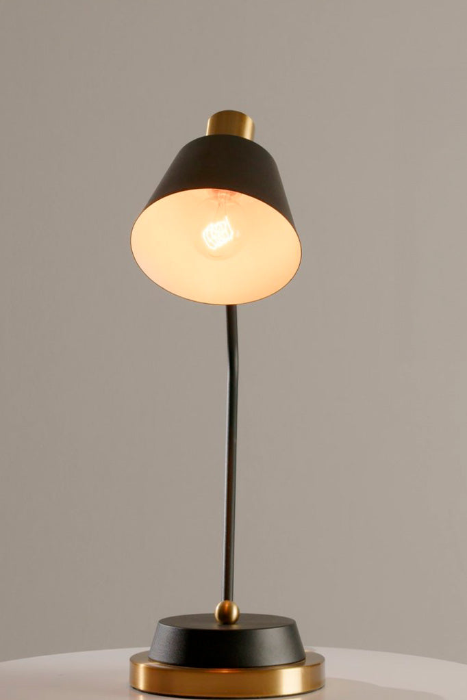 Experience the union of form and function with the Cine Table Lamp. This unique table lamp showcases a distinctive matt black metal shade and base, complemented with gold metalware accents. Enjoy a sense of sophistication and style as you read, work, or set the ambiance of your room. The Cine Table Lamp makes the perfect companion.