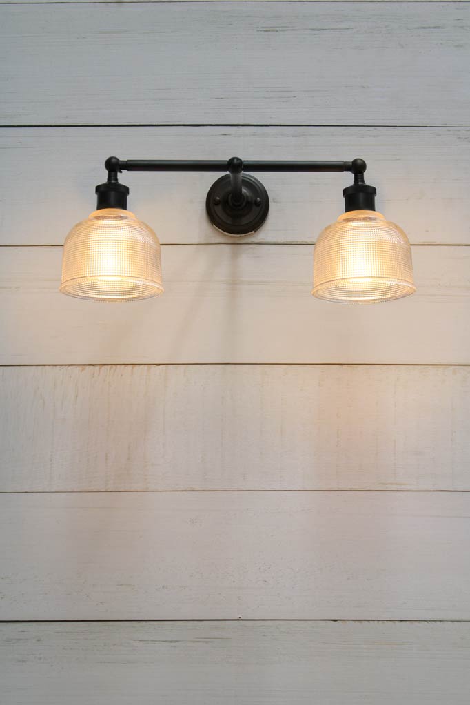 Drawing on the timeless design aesthetic of the early 1900s, the Chapman Glass Wall Lamp makes a lasting impression in any interior. Mounted on a steel double arm sconce its two holophane glass shades display a crosshatch finish and produce soft diffused lighting. Complete with swivel lampholders for added functionality and three finish options, this wall light makes a versatile solution for dark corners, breakfast nooks, entryways or cafe interiors.