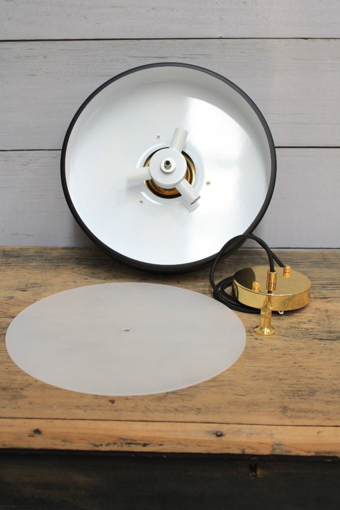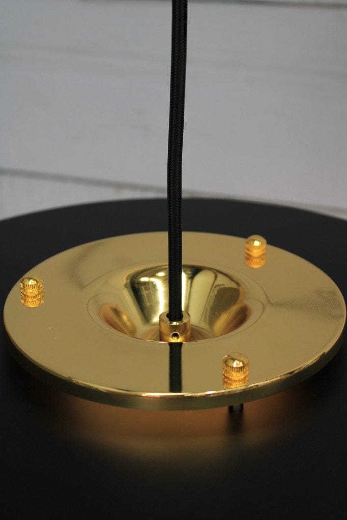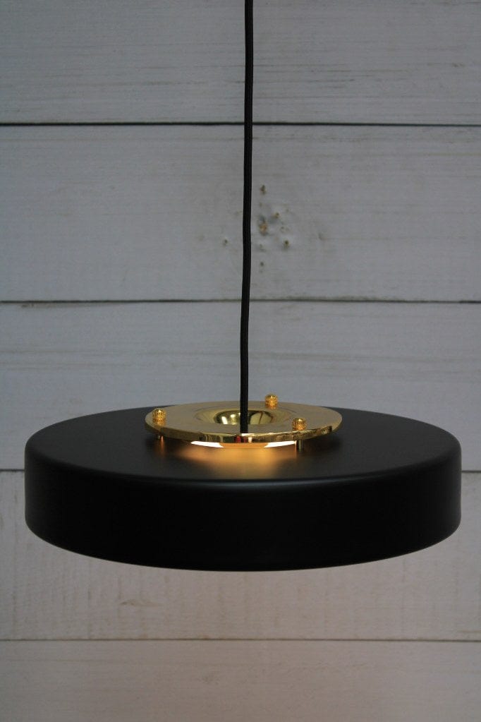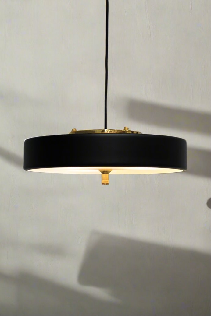 - This pendant features a matt black finish paired with gold/brass metalware.