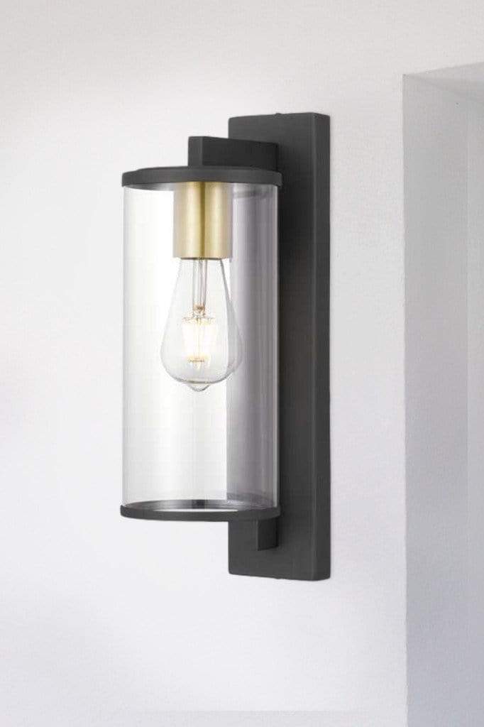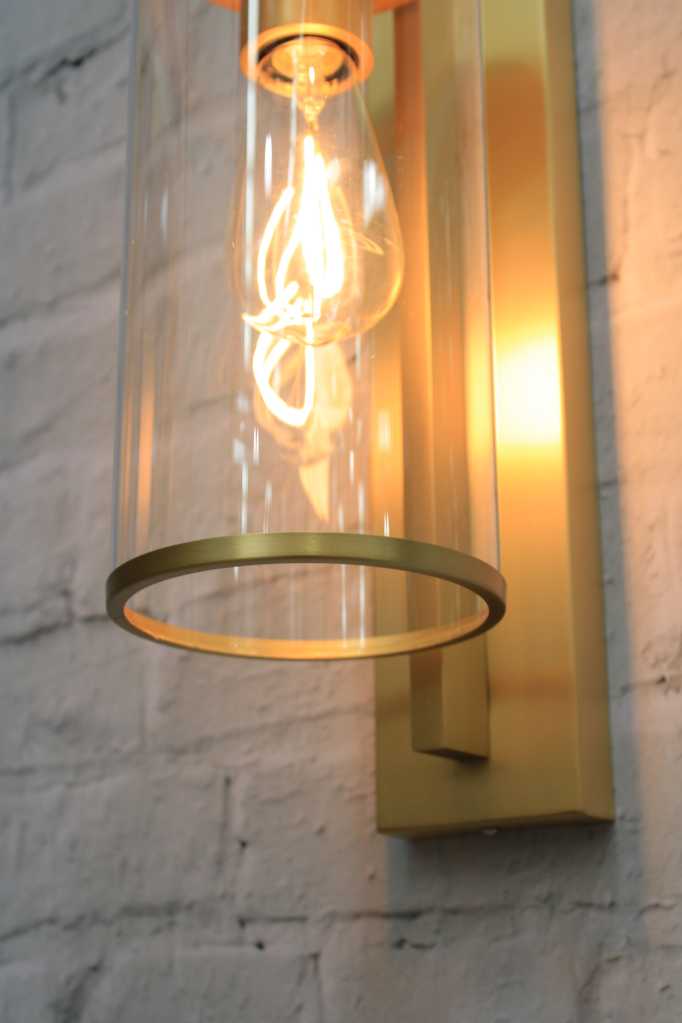 - The fixture is framed in solid brass with a tall glass cylinder. It is available in two finishes: Black and Brass.