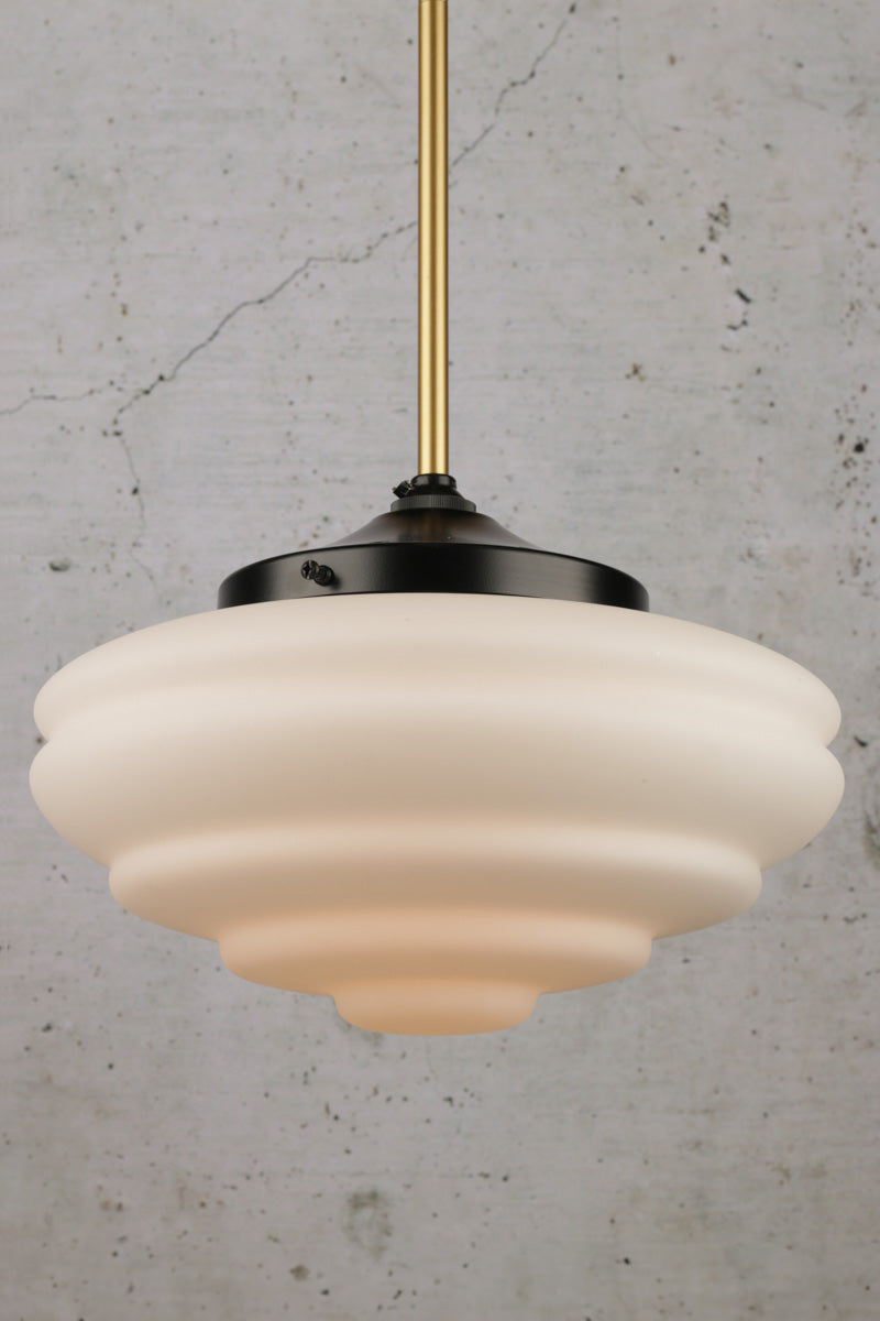 • It comes with pole pendant suspension in a black, gold/brass or white finish.