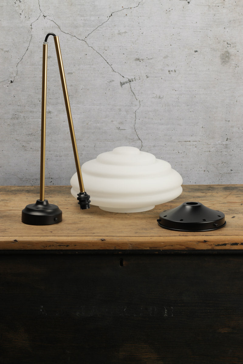 • The shade is fitted to the lampholder with a metal gallery. The black and white poles are paired with a matching gallery, the gold/brass pendant is paired with a black gallery. If you would like a matching gallery with this frame, please contact us.