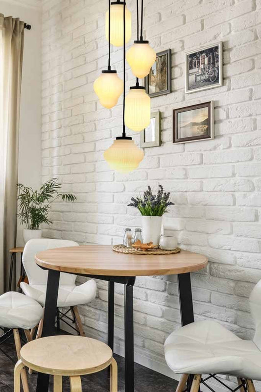 - 5 light pedant : Works well in medium to larger sized areas. Or where an extra-long pendant cord is needed like a 3m long cord to hang in a void or drape over a dining tables or room with higher ceilings. Take a look at Dakota Reeded Glass Multi Drop with it's brass lampholder, glass shades available in clear or amber.