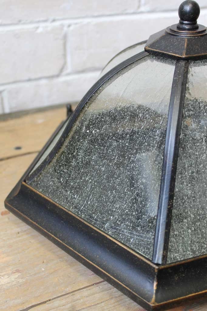 This Regent Outdoor Ceiling Light will bring timeless appeal and add character to any indoor or outdoor space. This flush mount light has antique bronze or antique black metal rib panelling encasing the decoratively aged glass. It is weather resistant and can be used for outdoor and indoor use. It will add regal character to your space, entryway or porch. Suitable for commercial fit-outs too; restaurants, taverns, hotels, bars and beer gardens.