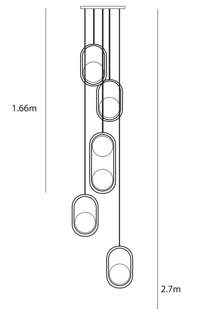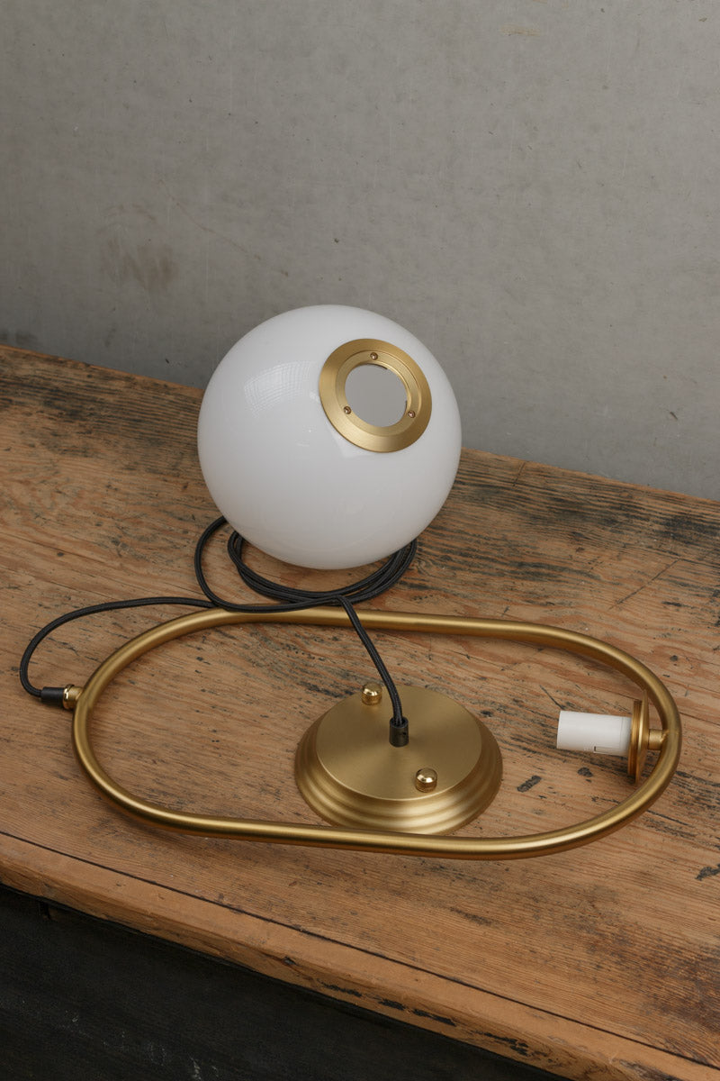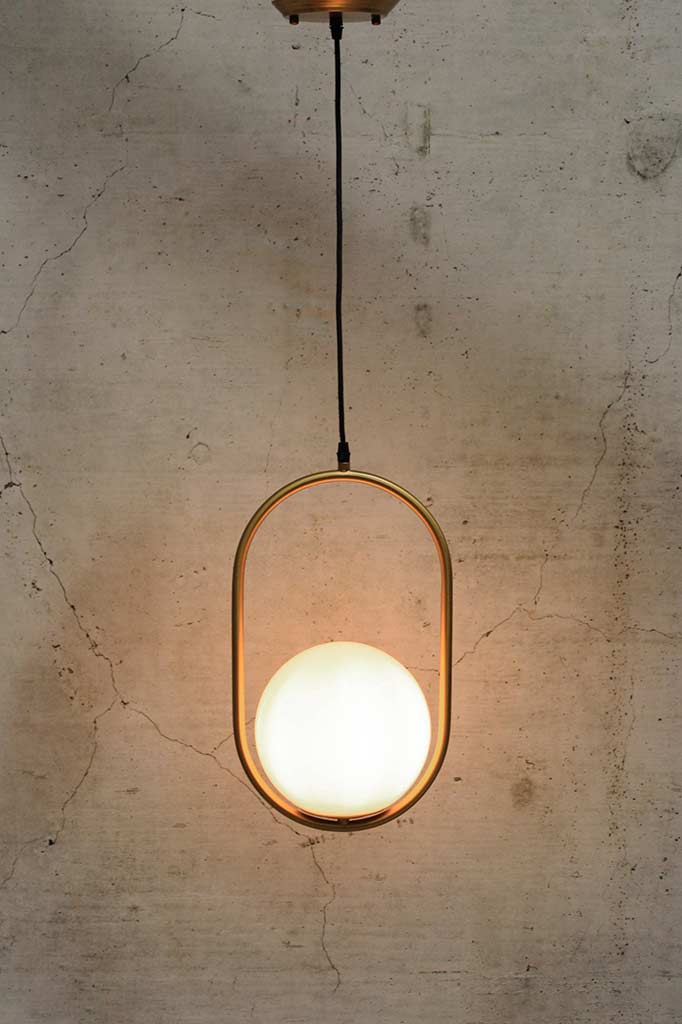 - It features an opal ball shade suspended in an oval metal frame.