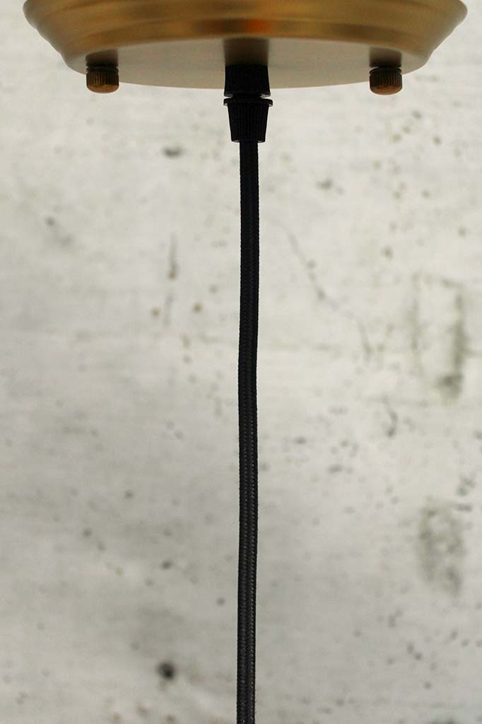 - The pendant light is suspended by a black fabric cord.