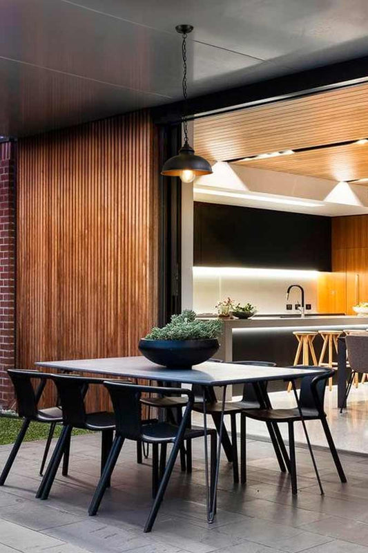 Pendant lights are not just for indoor use and are commonly found in outdoor settings. They can be hung from a fully covered roof, verandah, porch or patio and are great for illuminating tables, benches and seating areas.