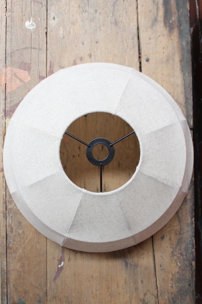 - Features a black metal inner frame and an outer dome shaped fabric linen shade with neutral colour tone.