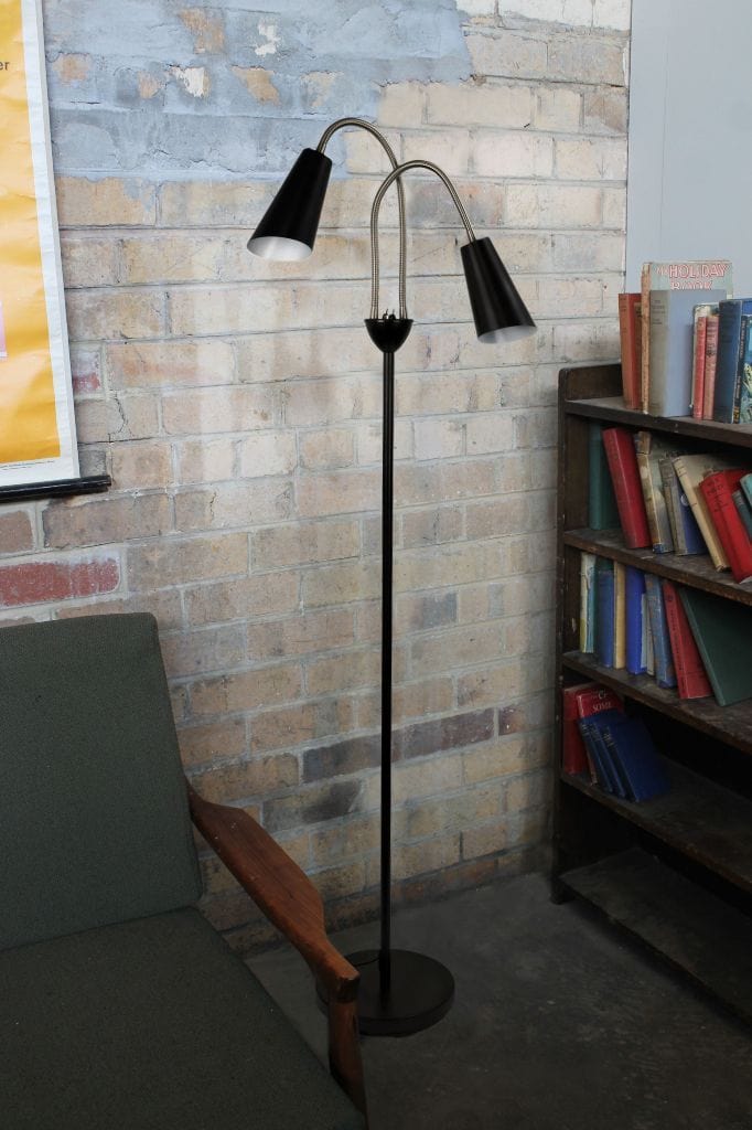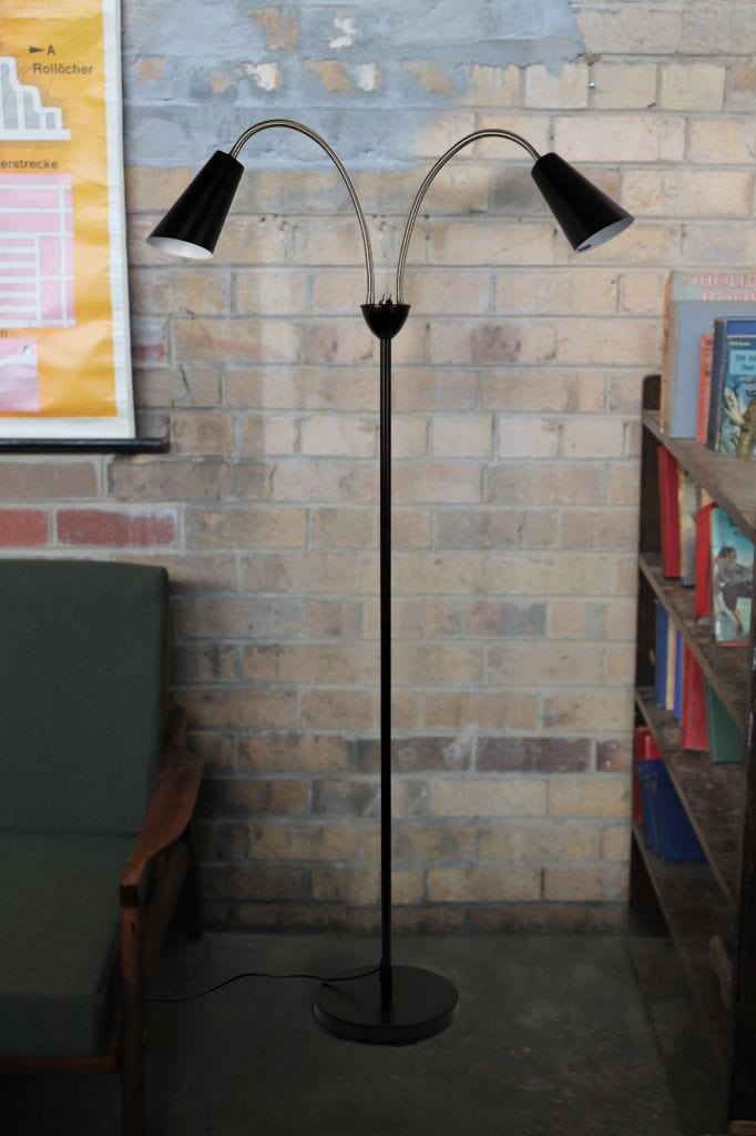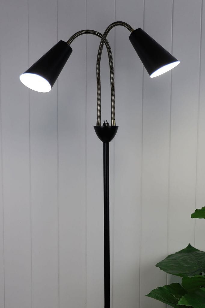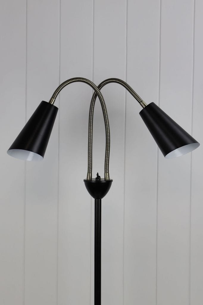 Blending flair and functionality, this mid-century style Two Light Floor Lamp offers a versatile DIY lighting update for any interior. Featuring a sleek matt black design, its two metal shades are affixed to flexible gooseneck arms in either brushed chrome or antique brass finish. As an added advantage, each shade can be turned on/off separately by switches conveniently located on the central base. A source of both task lighting and supplementary lighting, this floor lamp brings a chic retro touch to your living room, home office, bedroom or reading nook.