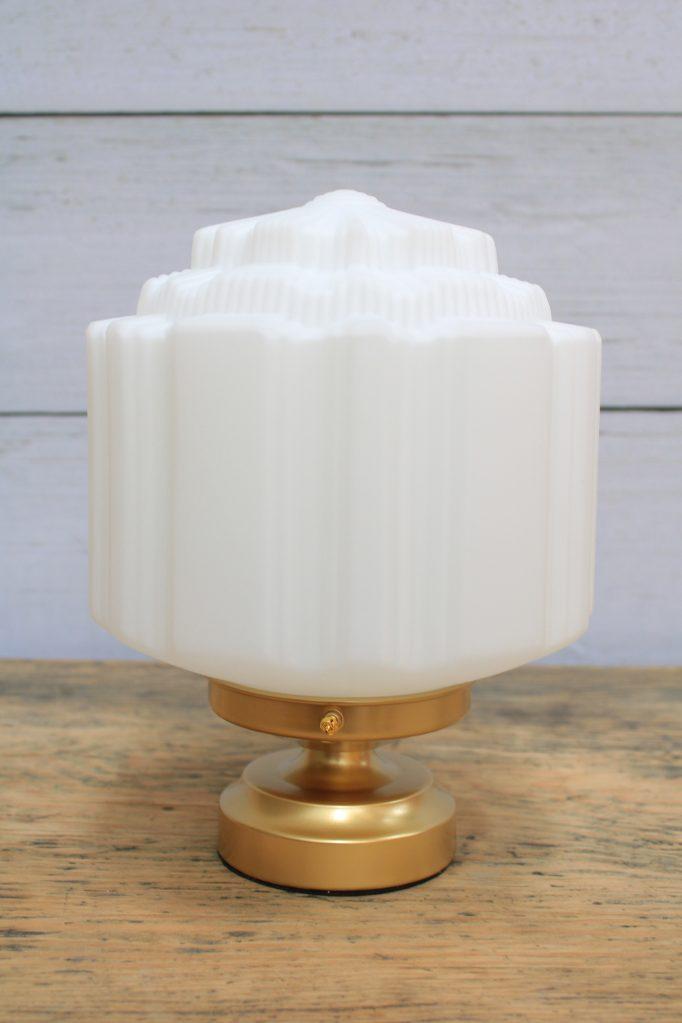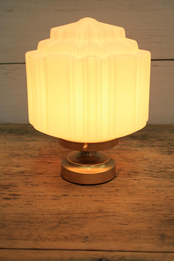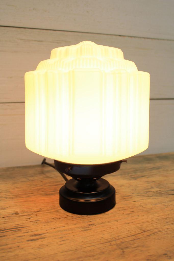 - This table lamp features an art deco style opal glass shade.