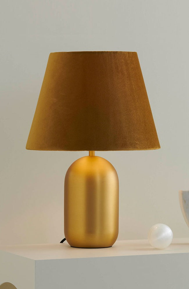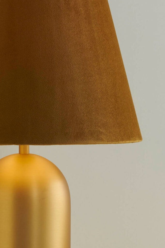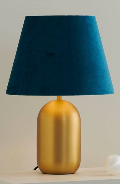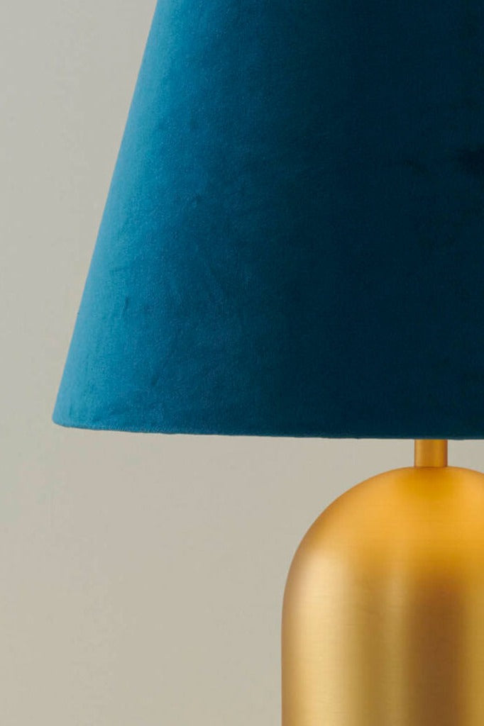 The Holyrood Table Lamp exudes vintage glamour. The richly hued blue or gold velvet shade is paired with a satin brass cylindrical base for a luxe mid-century effect. Evoke the charm of yesteryear by styling on modern or mid-century sideboards or tables. This lamp will enhance any bedroom, lounge, low-lit bar or intimate seating area. Crafted with functionality and style in mind