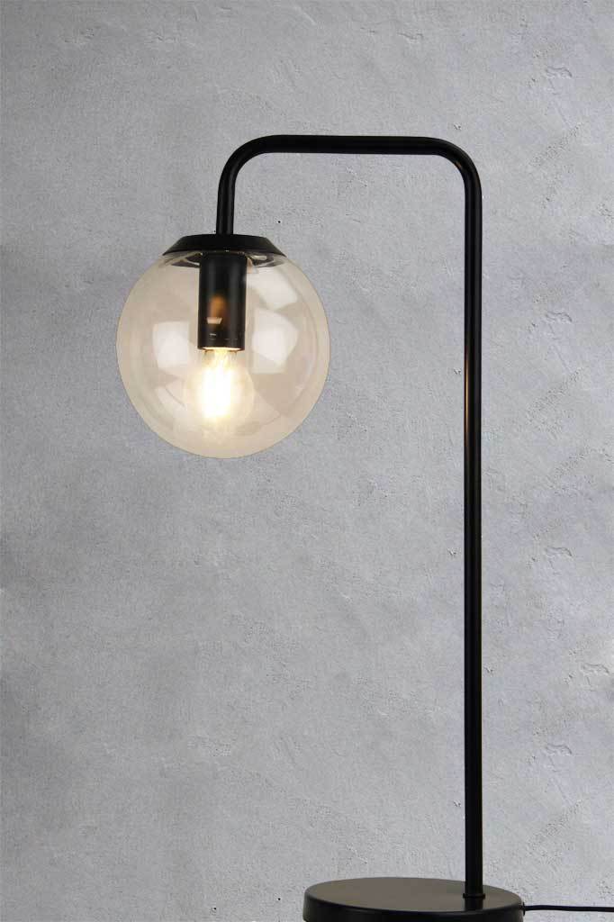 - Constructed from metal, this lamp is finished in Black or Antique Brass. A transparent spherical glass shade completes the look.