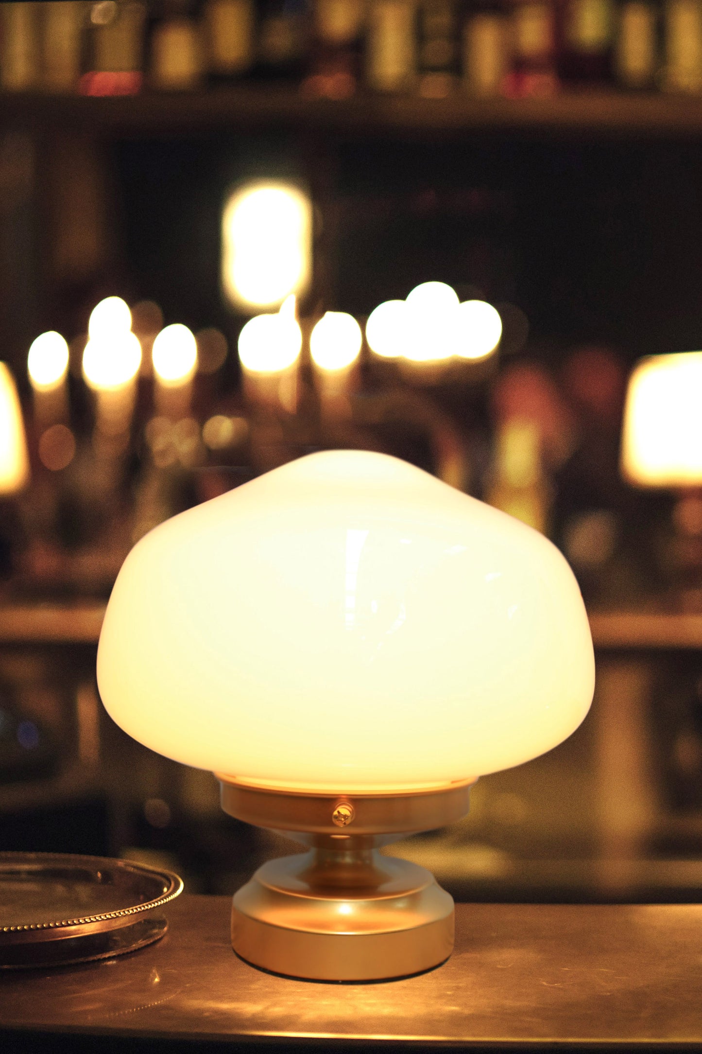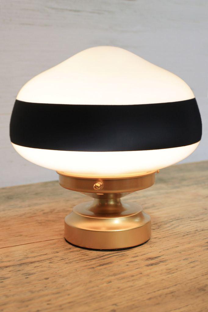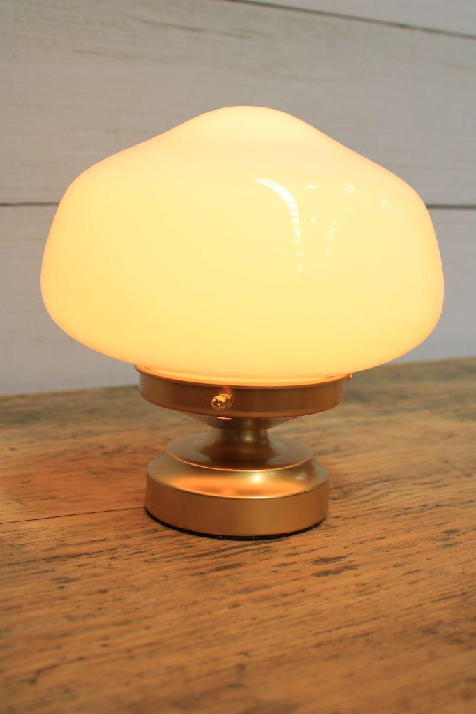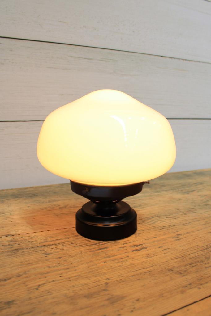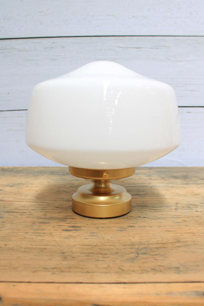 - This table lamp features a classic opal glass shade that diffuses light.