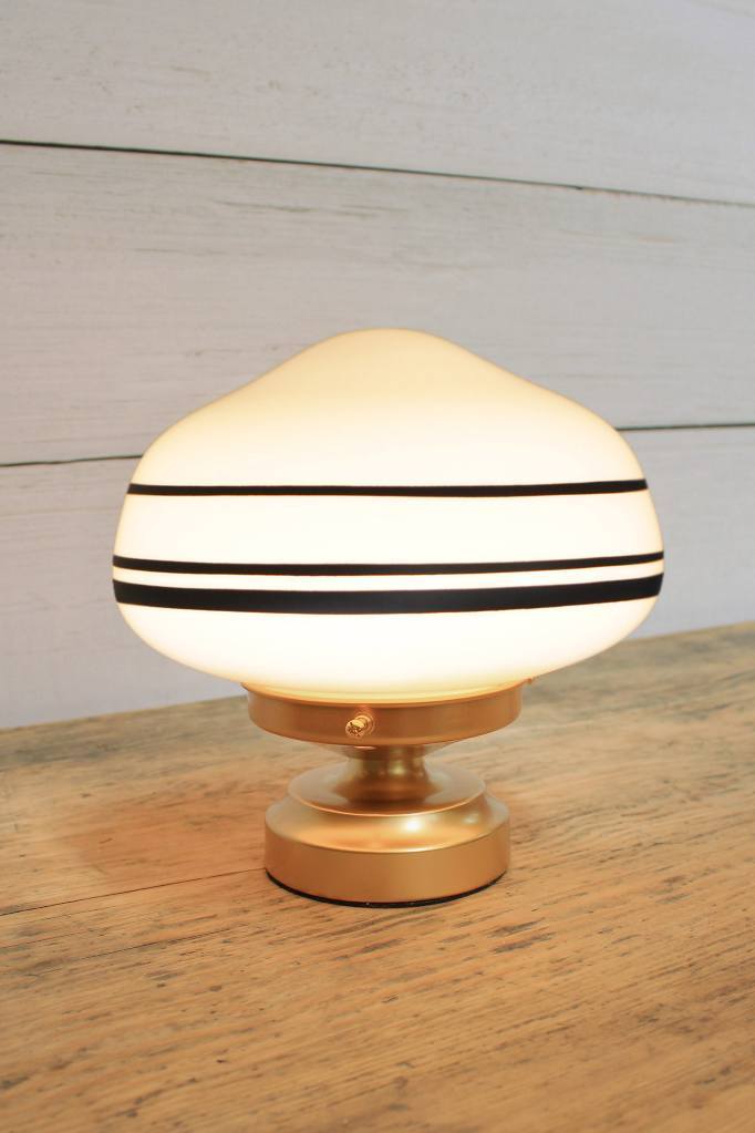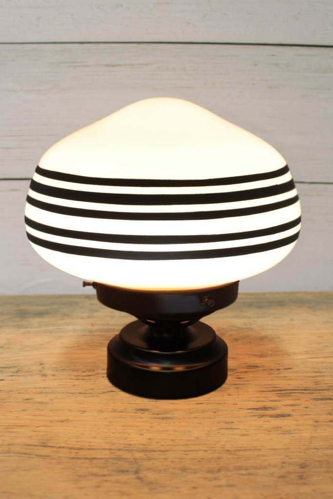 The Washington Schoolhouse Lamp adds a small but brilliant vintage accent to any space. Its handblown opal glass shade comes in two sizes and includes hand painted stripe styles for added flair. Popular in the 1920s, this schoolhouse shade is a beautiful reproduction of the classic lighting style found throughout public buildings of the time. The base comes in two classic yet modern finishes. This versatile little piece would be perfect in a variety of settings from libraries, bedsides, home offices, cafes, and restaurants.