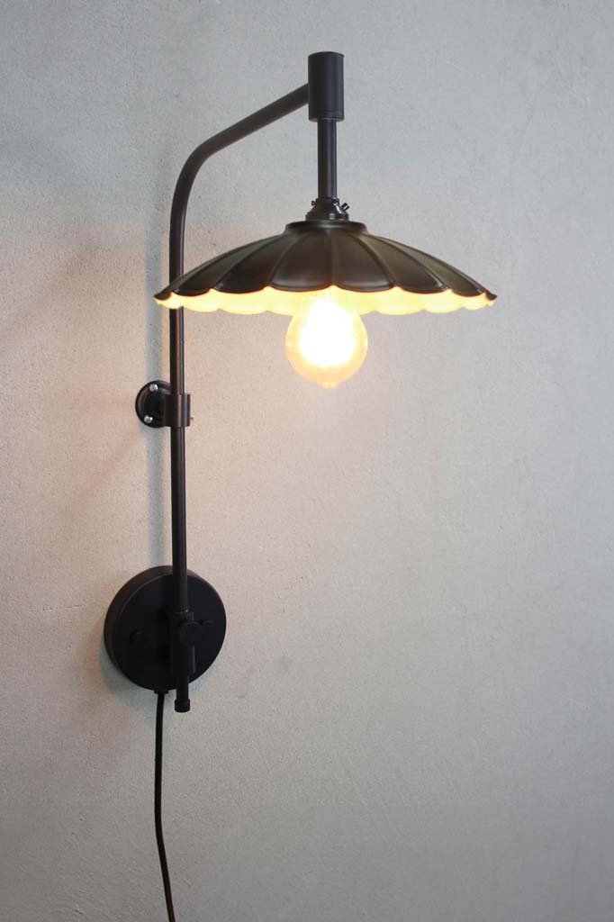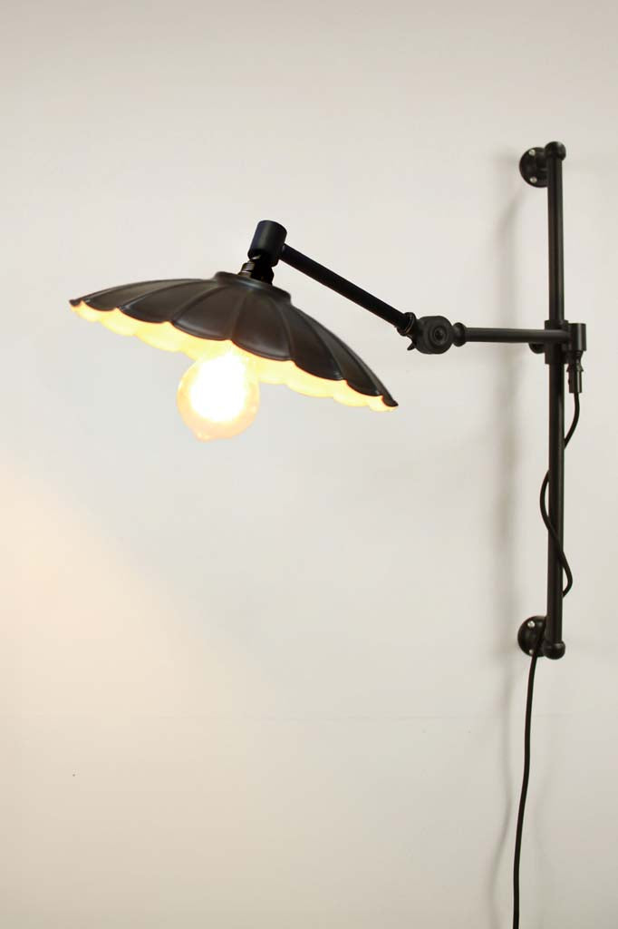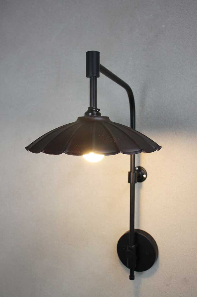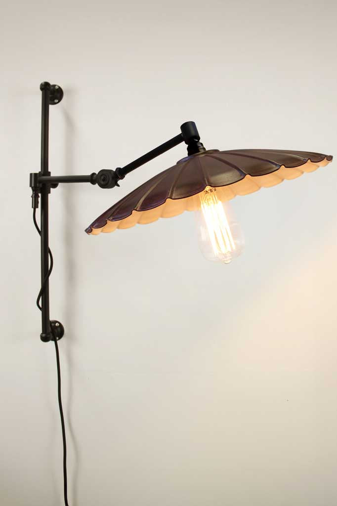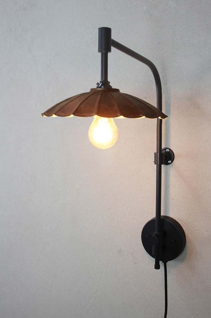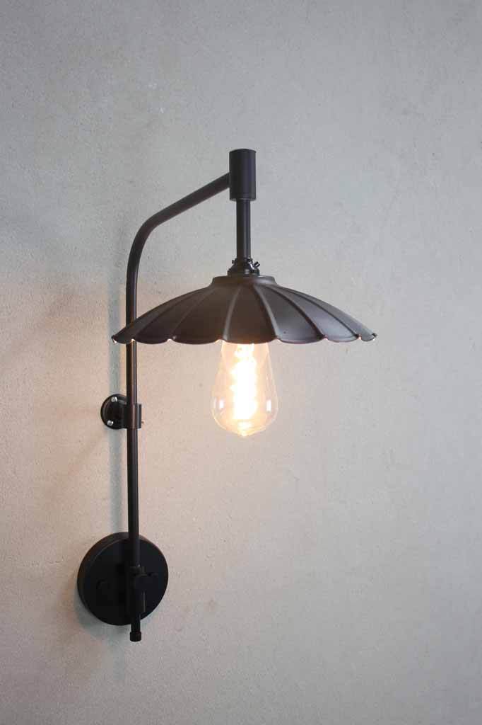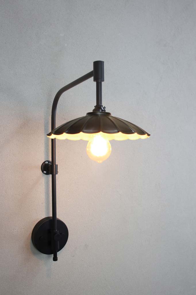 Exude authentic rustic industrial character with the Umbrella Wing Arm Wall Lamp. The rustic style scalloped shade contrasts harmoniously by either a metal wing or swing arm wall mount. The swing arm light can be angled and moved to a desired height along the main pole. The wing arm is able to maneuver 180 degrees once installed to the wall. This unique homely light would suit a brewery or winery as well as a traditional or provincial styled house. Available only at Fat Shack Vintage!
