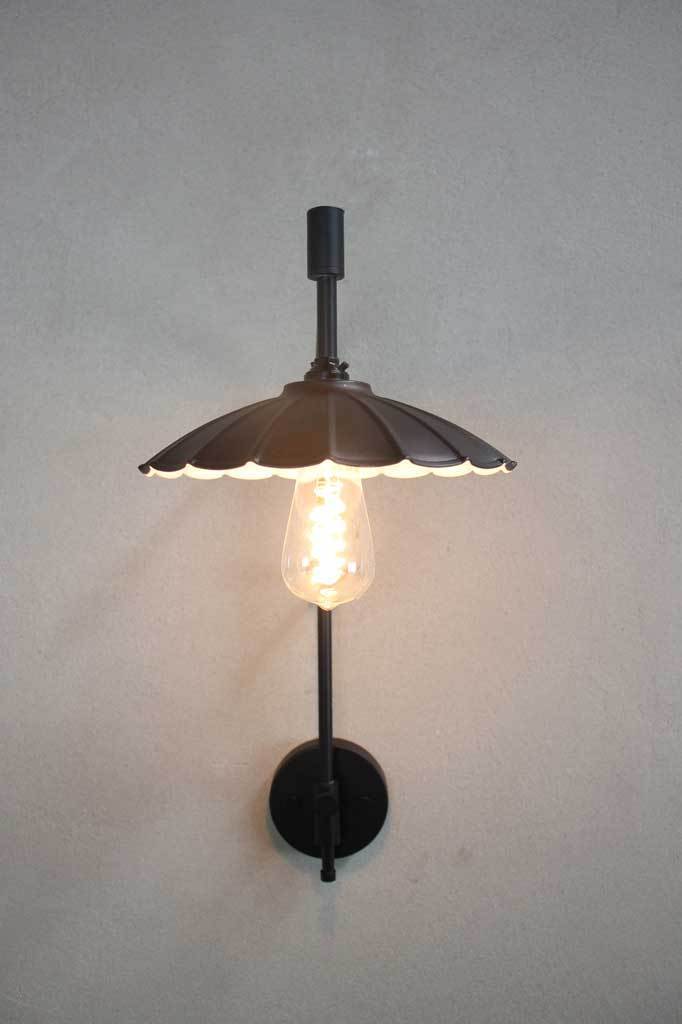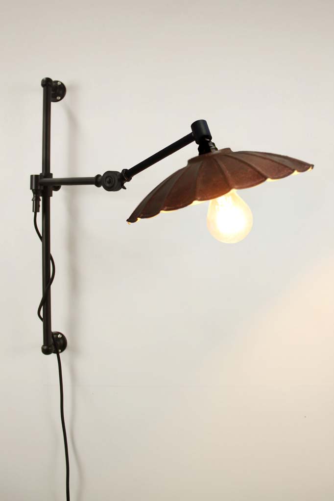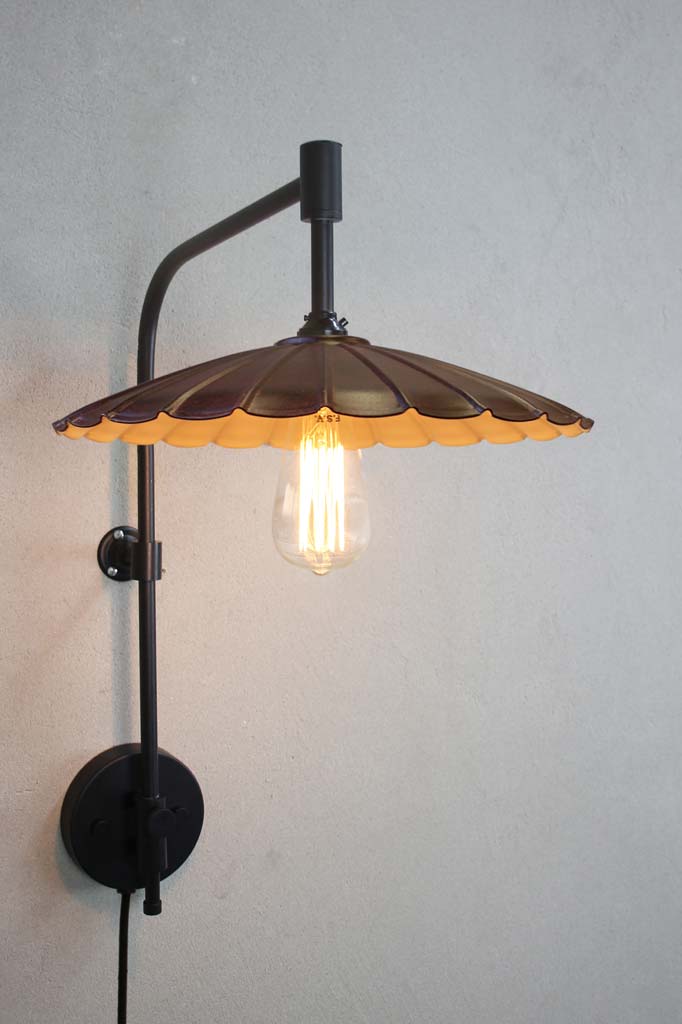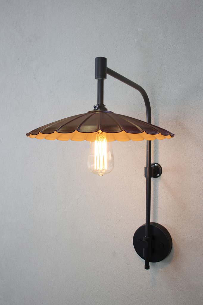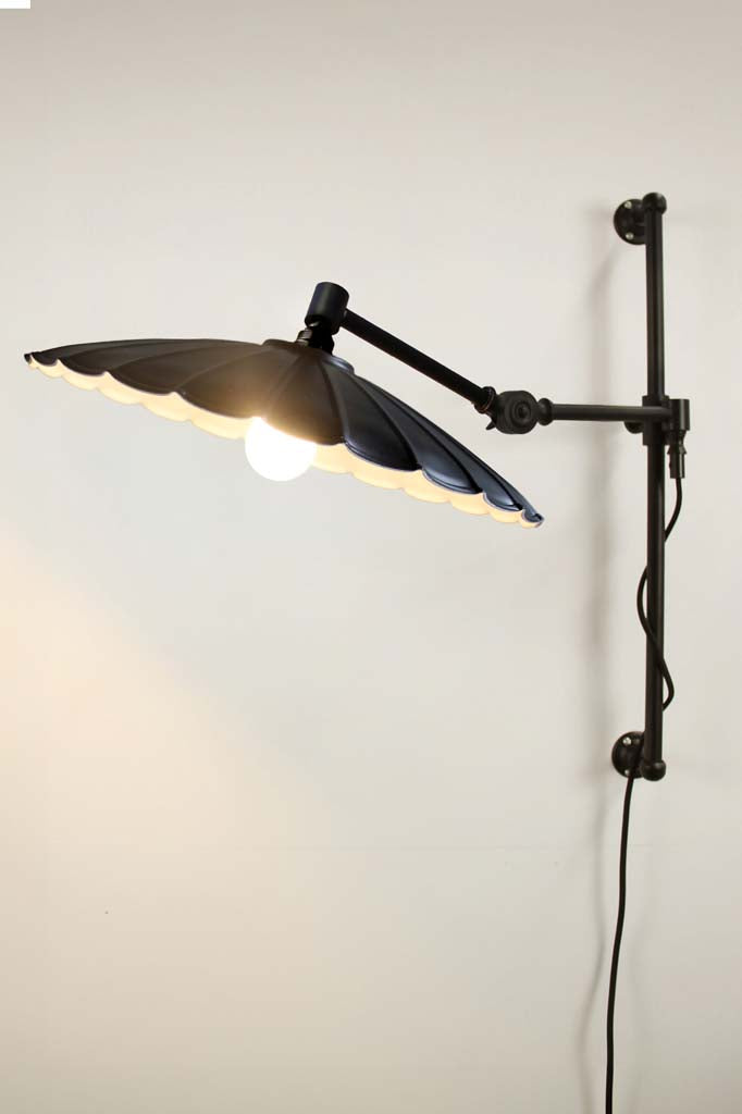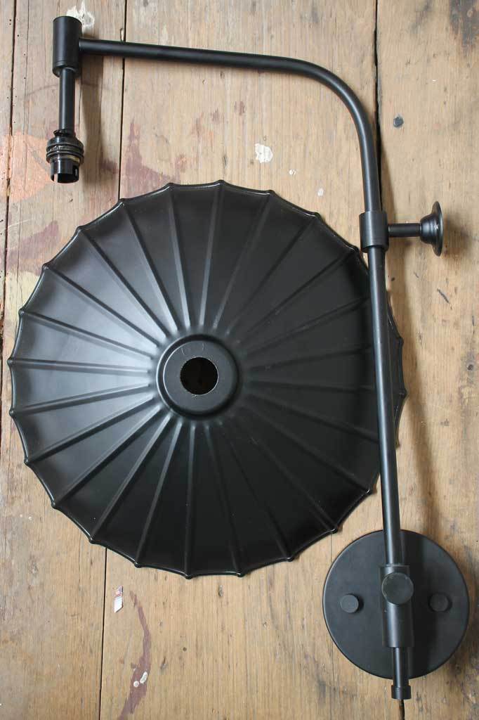 Exude authentic rustic industrial character with the Umbrella Wing Arm Wall Lamp. The rustic style scalloped shade contrasts harmoniously by either a metal wing or swing arm wall mount. The swing arm light can be angled and moved to a desired height along the main pole. The wing arm is able to maneuver 180 degrees once installed to the wall. This unique homely light would suit a brewery or winery as well as a traditional or provincial styled house. Available only at Fat Shack Vintage!