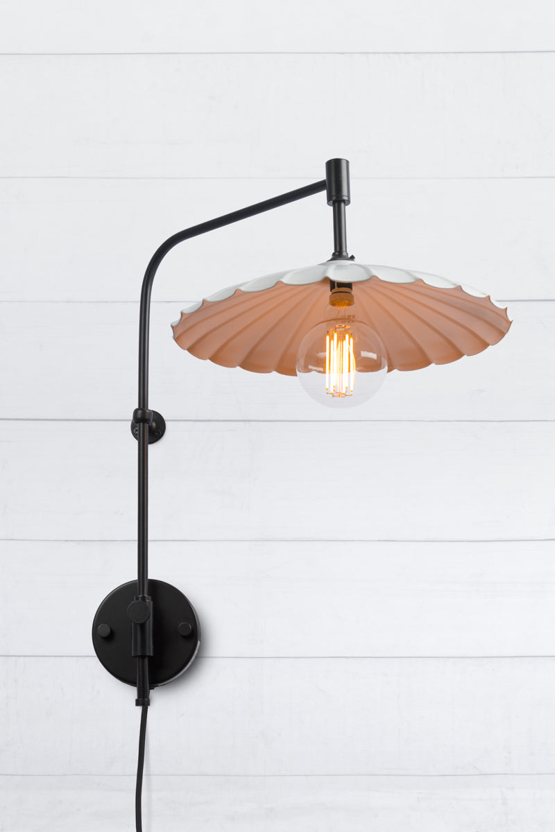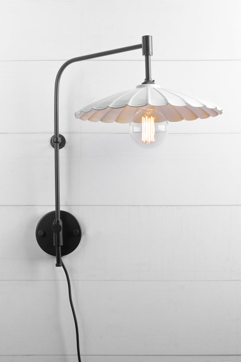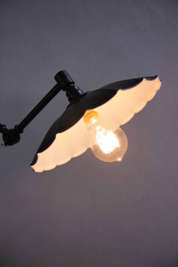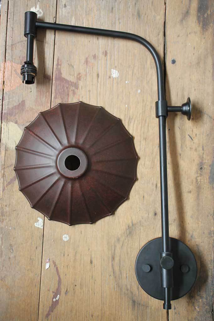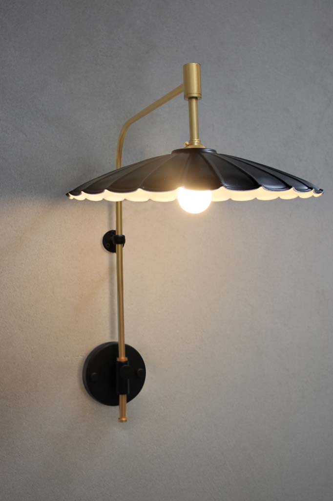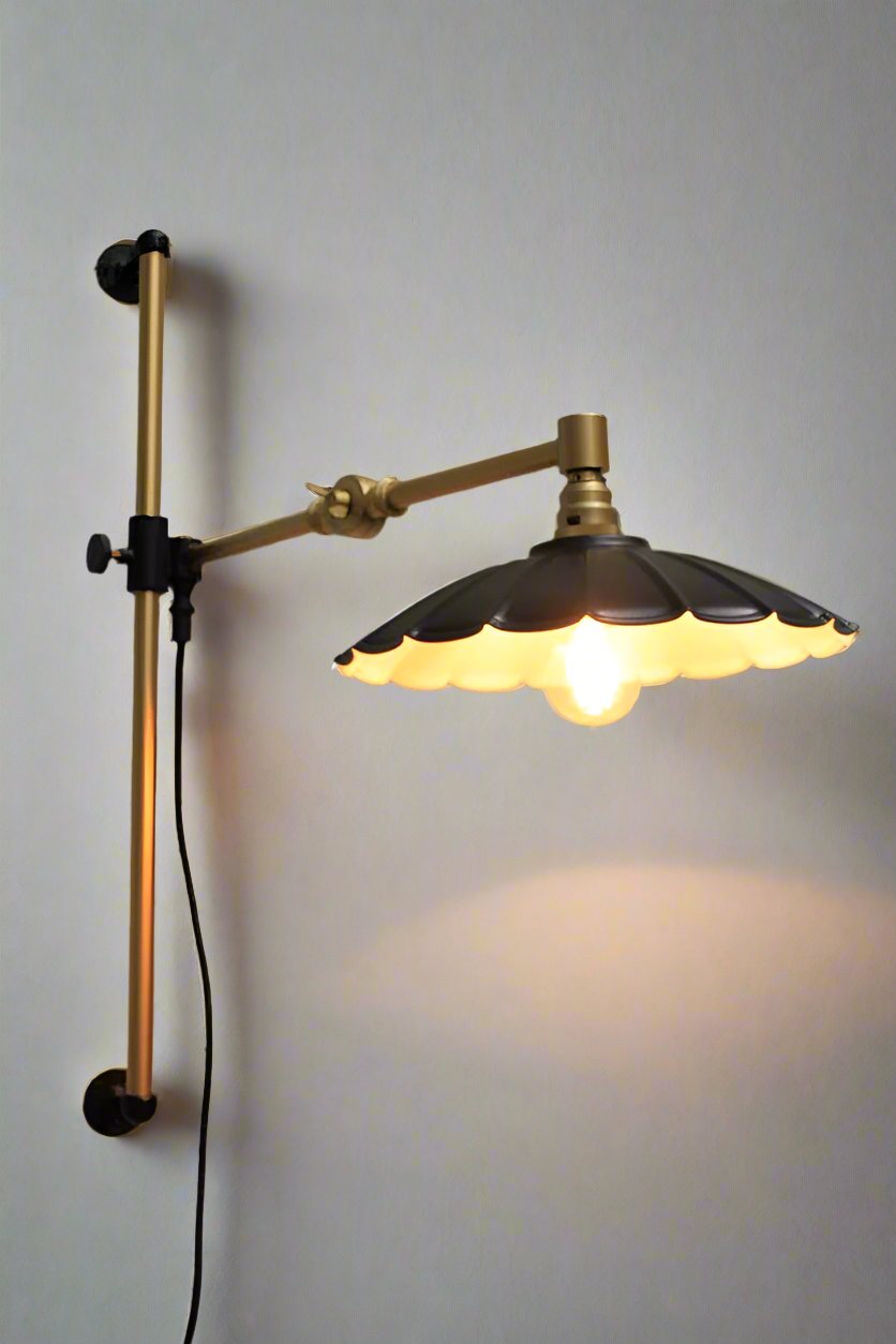 Exude authentic rustic industrial character with the Umbrella Wing Arm Wall Lamp. The rustic style scalloped shade contrasts harmoniously by either a metal wing or swing arm wall mount. The swing arm light can be angled and moved to a desired height along the main pole. The wing arm is able to maneuver 180 degrees once installed to the wall. This unique homely light would suit a brewery or winery as well as a traditional or provincial styled house. Available only at Fat Shack Vintage!