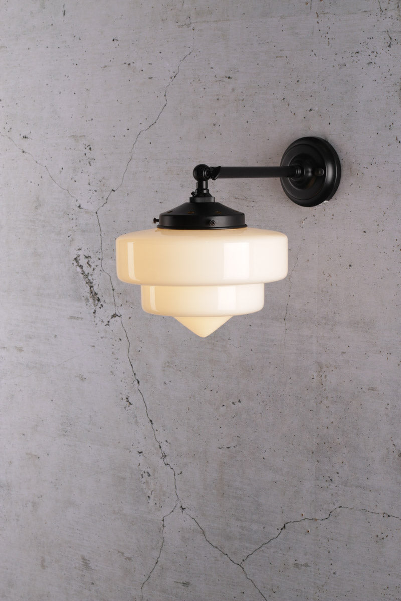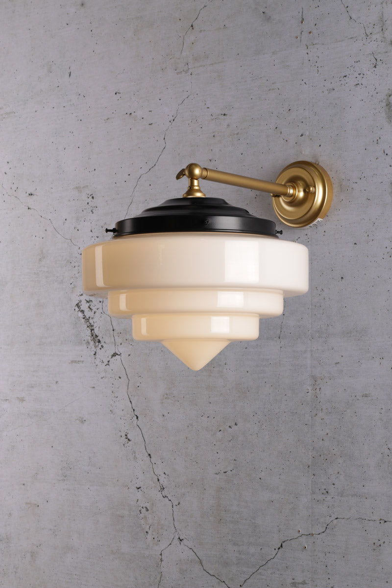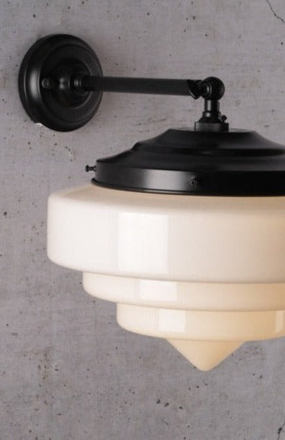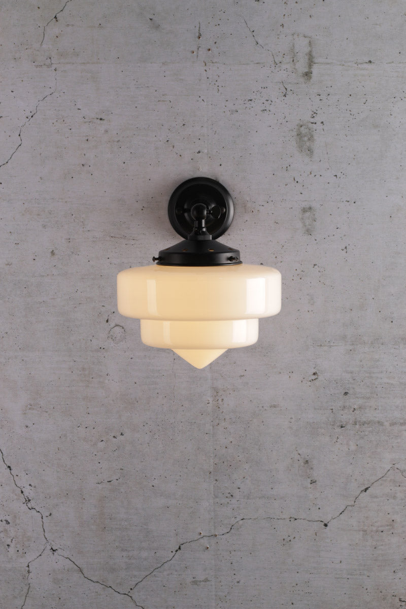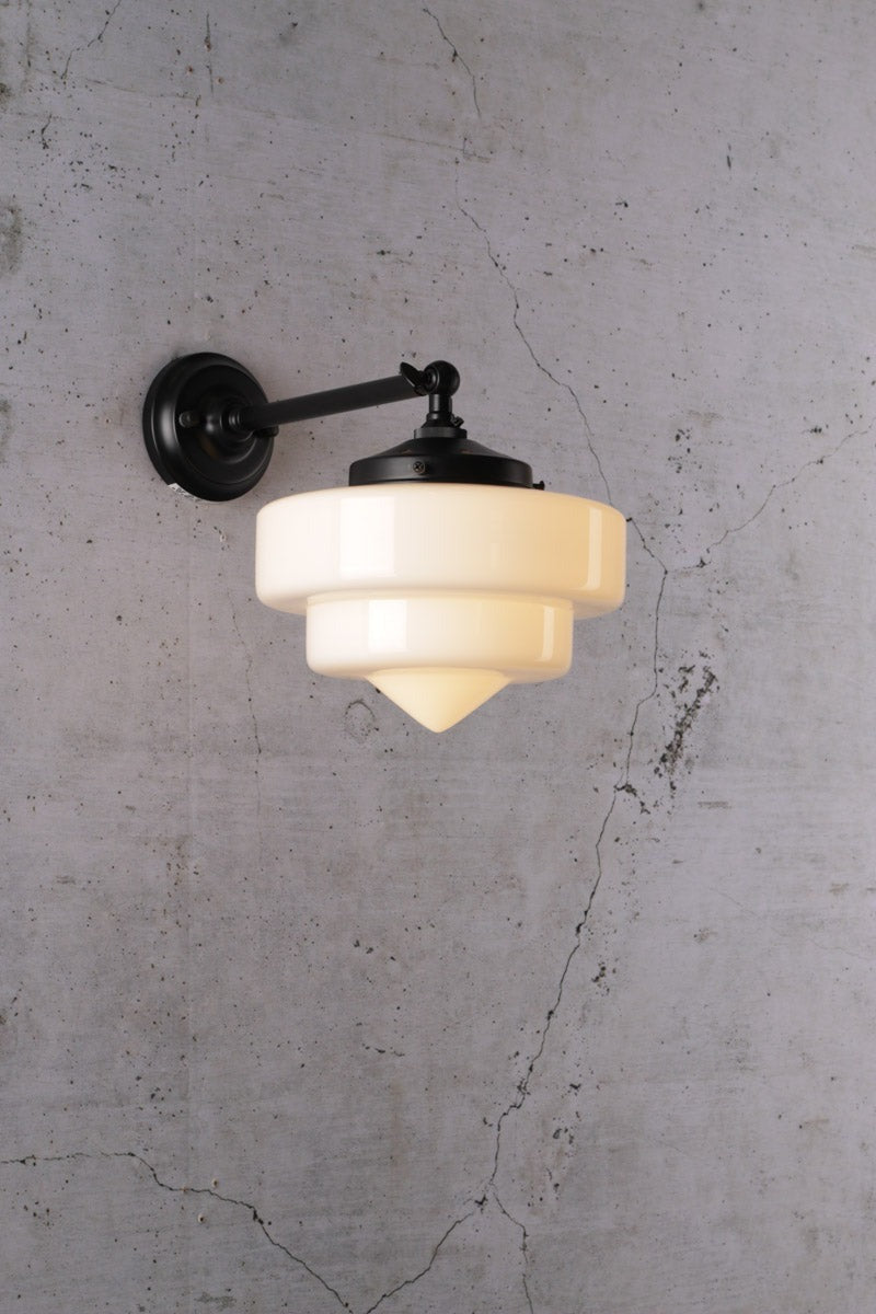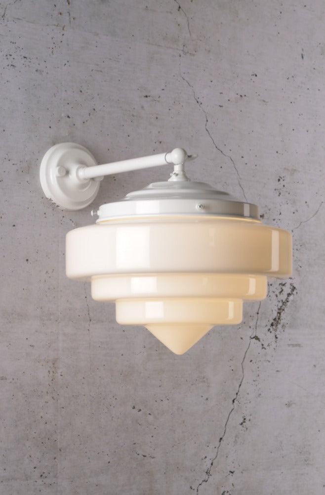 - Its deco style opal glass shade diffuses light. Features a tiered level design shaped in the the shade. Two sizes available.