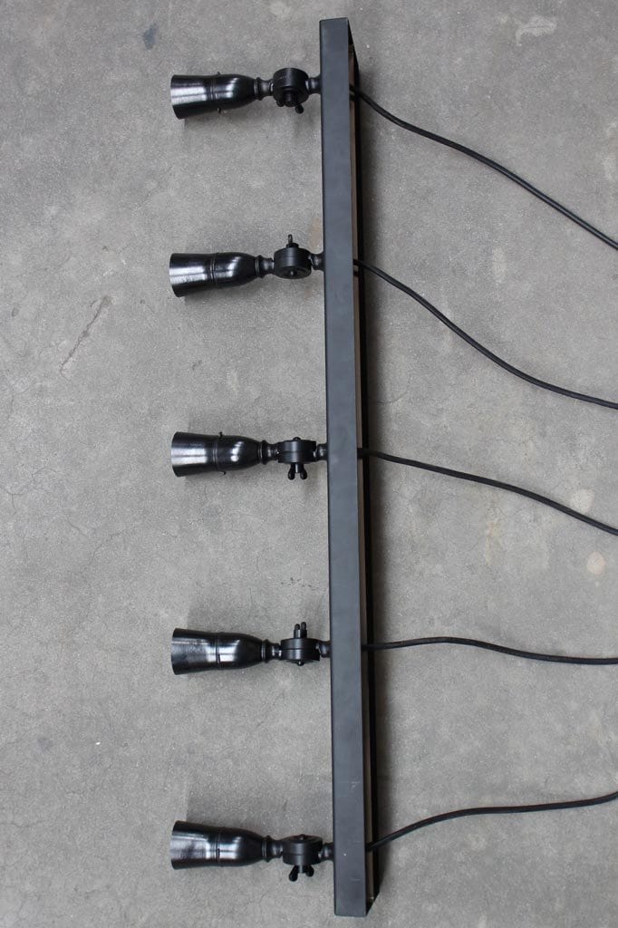 The functional 5 Light Flush Mount is a simple yet effective light. It features five evenly spaced lampholders on a black rectangular ceiling rose. The lampholders are adjustable, so you can create some directional illumination. Use in one story prefabricated homes or in retail stores and shops.