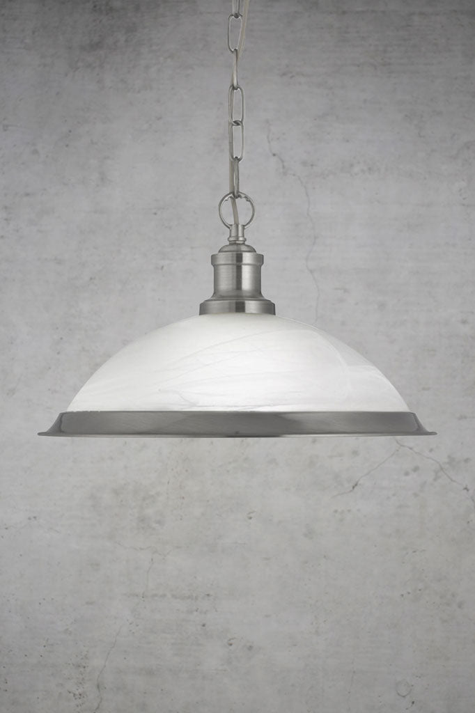 The Alabaster Glass Pendant Light marries traditional style with a contemporary aesthetic. Its metal fixture available in satin chrome, support an opaque alabaster glass shade. It is perfect for adding a timeless touch to a dining table, kitchen island, hotel bar, country lodge, or restaurant.