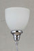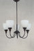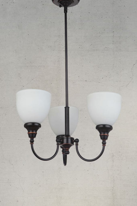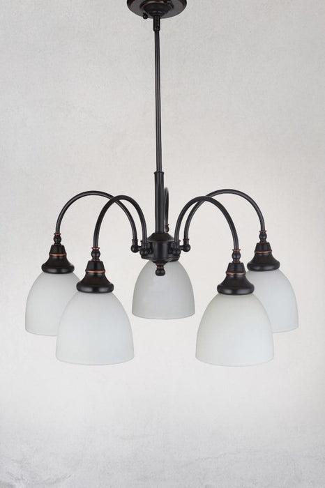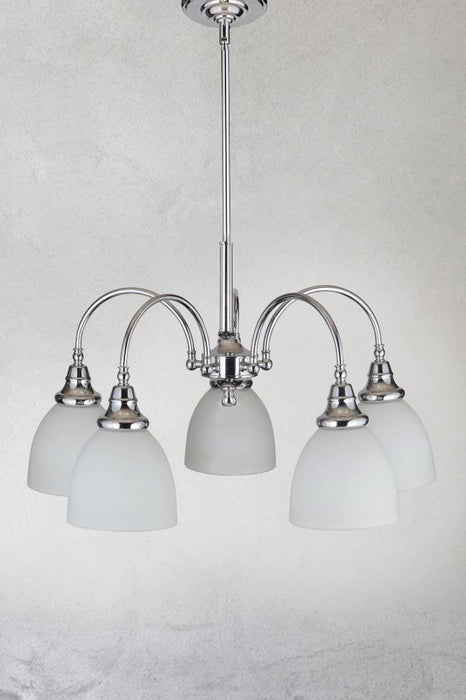 - This chandelier is comprised of a metal frame finished in bronze, chrome or stain brass, frosted glass shades and a metal suspension rod.