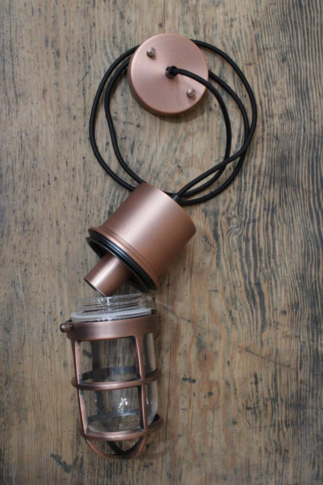 Reigniting the nautical charm of yesteryear, the Anchorage Caged Bunker Pendant Light offers a nostalgic touch for your interiors. Its glass shade encased in metalware brings distinctive flair. The pendant light comes in a copper finish and is suspended from a black cloth cord. This pendant light can be a stand alone feature above a dining table or in an entryway or arranged in multiples in a vintage style café or restaurant.