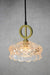 - This pendant light features an ornate glass shade with a cut design.