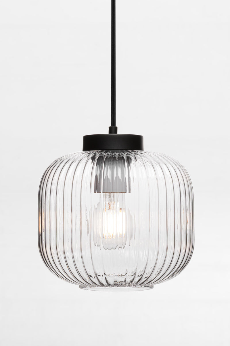- Reeded glass shade comes in amber, clear or grey finishes.