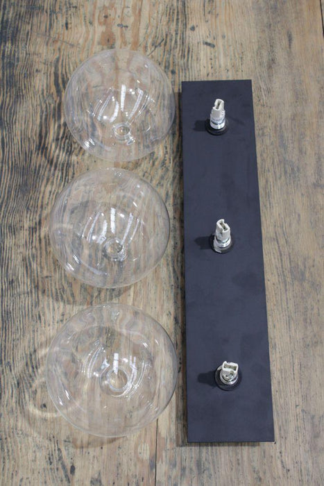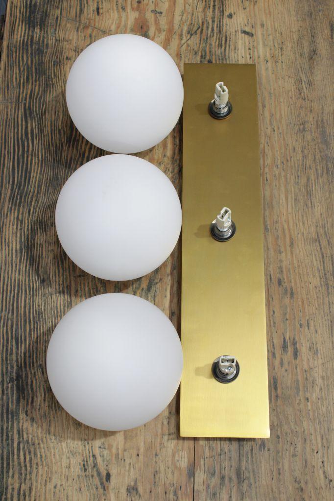 • Mounted to a linear metal bar, its three glass sphere shades come in opal or clear finish.