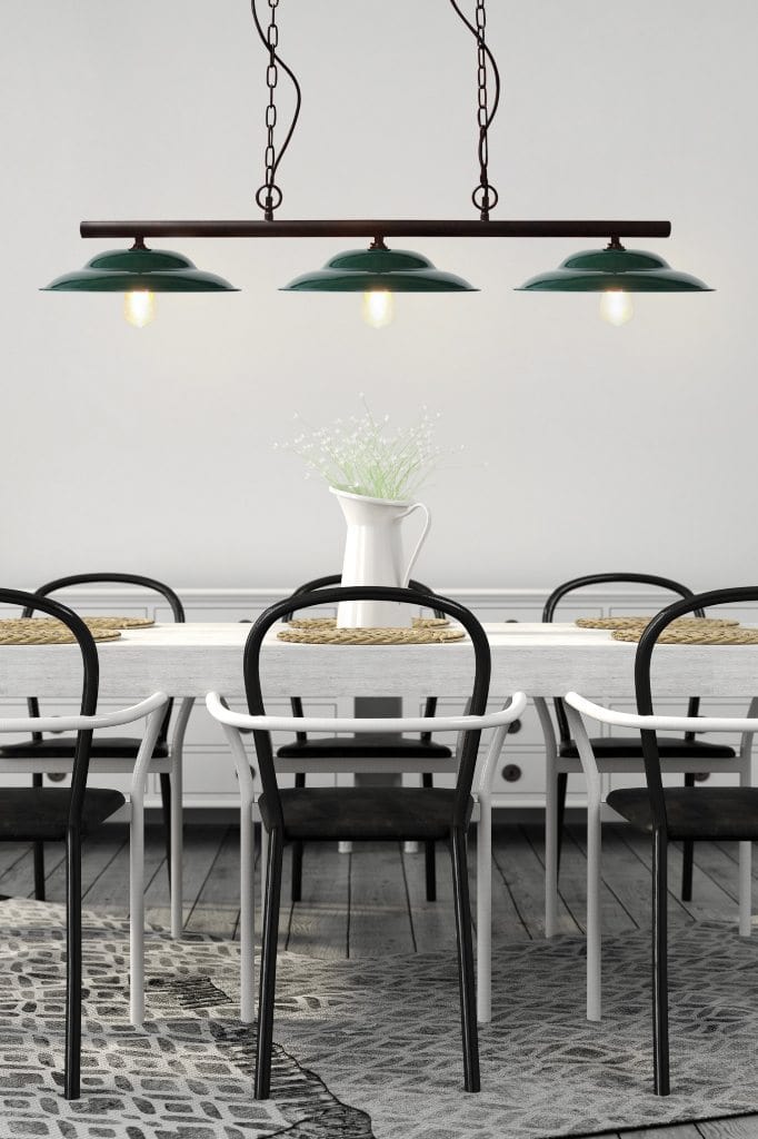 A charming mix of vintage and farmhouse design, the Barn Swing Pendant Light combines the best of both styles. The vintage styled enamel or copper shades sit on a black metal bar which is attached to the ceiling rose by industrial-style chains. Hang over an island bench top in a country style kitchen or on a high ceiling above a dining table. Commercially this pendant would suit pub fitouts, vintage cafés and large warehouse venues.