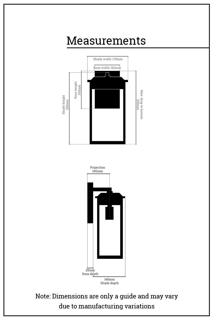 - Total height from the top of the wall mount to the bottom of the lantern is 335mm.