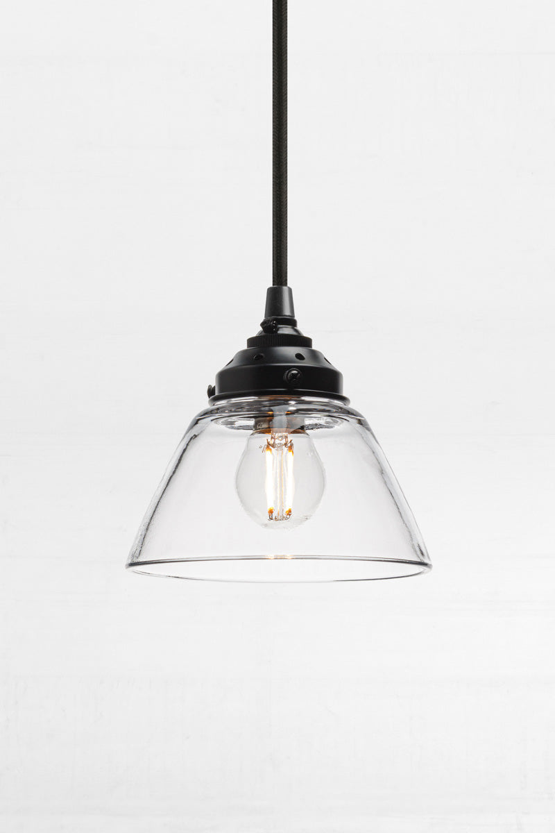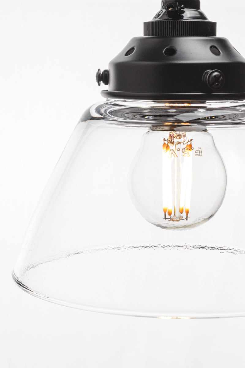 - Tapered clear handmade glass shade with a wide opening