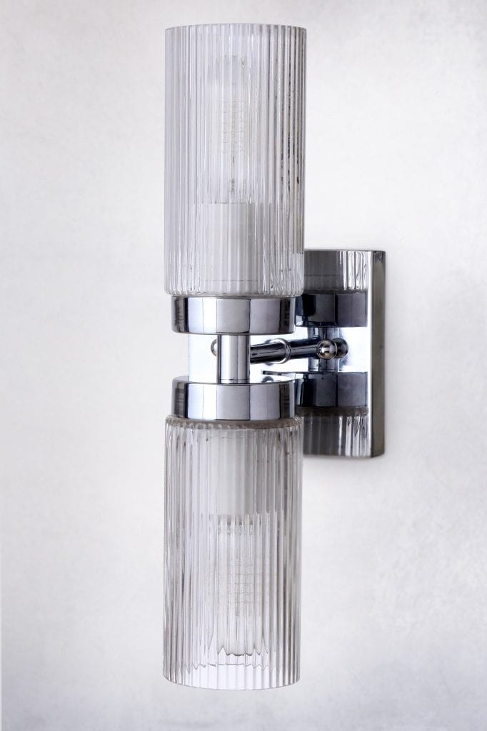 • These wall lights are comprised of a metal sconce finished in chrome or black, paired with a ribbed cylindrical glass shade.