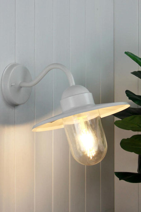The Berth Outdoor Wall Light offers classic outdoor illumination. Featuring a traditional gooseneck arm and angular head, it projects light outwards, ideal for porches, cafe courtyards, or pub beer gardens. With an IP44 weather resistance rating and available in black, white or a brushed copper finish, it provides a smart, coordinated outdoor lighting solution.