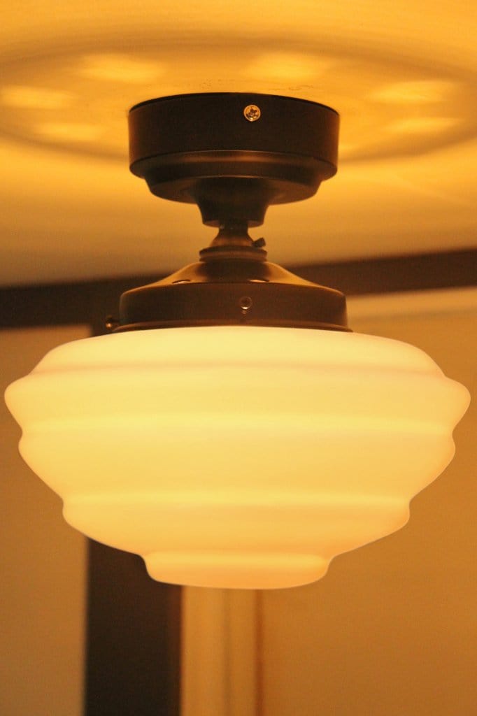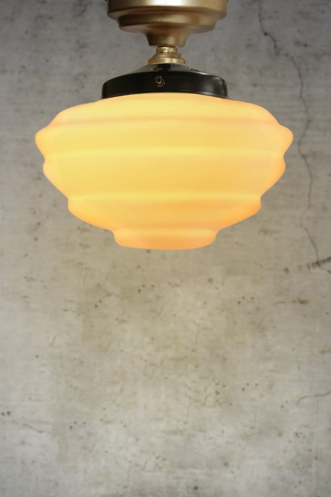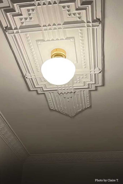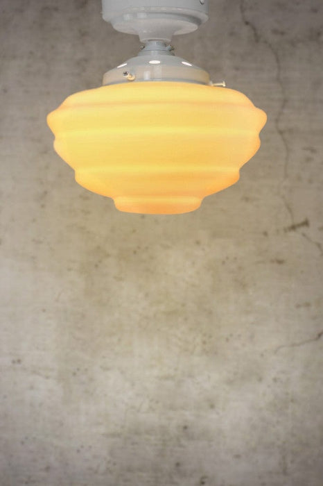 This timeless glass light is a great option for small rooms or low ceilings. The classic style pressed opal glass shade is attached to a curved ceiling rose which allows it to sit flush against the roof. The curved lines of this glass ceiling light make it a charming addition to any room. Place it over a vanity in a powder room, throughout a small kitchen or down a long hallway.