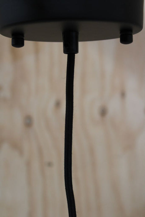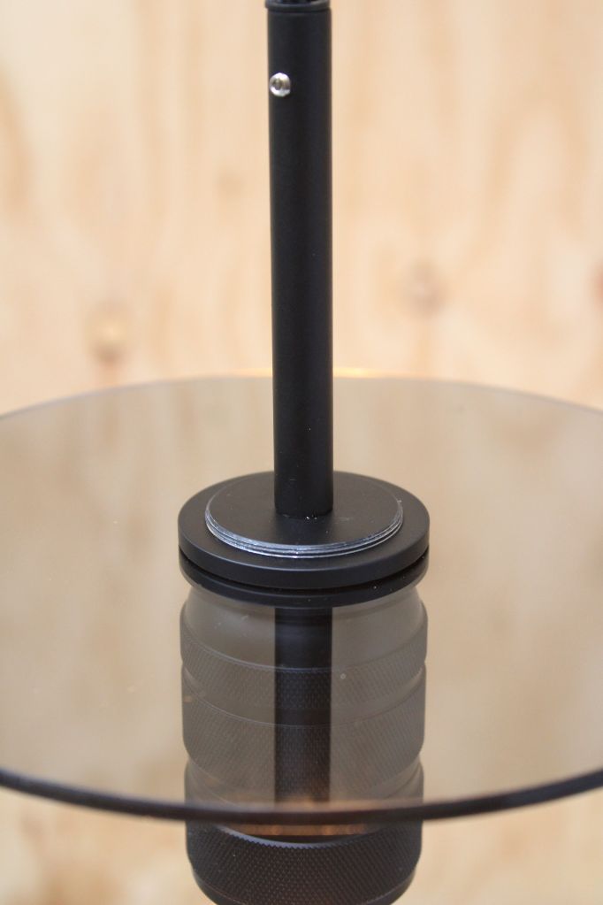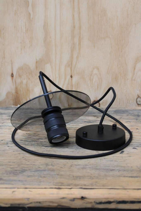 - This pendant light is comprised of a black metal lampholder and ceiling rose, black fabric suspension cord and round smoked glass disc.