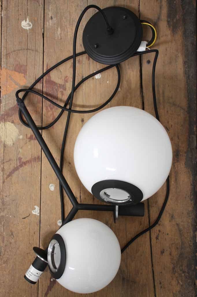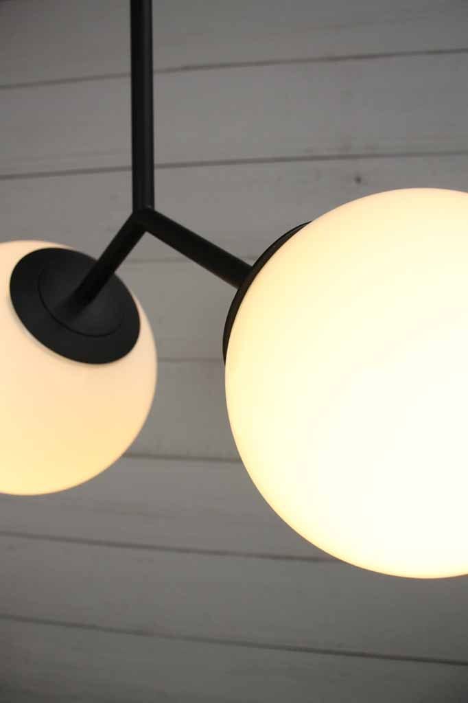 - This pendant is comprised of matt black metal fixtures and two opal glass shades.