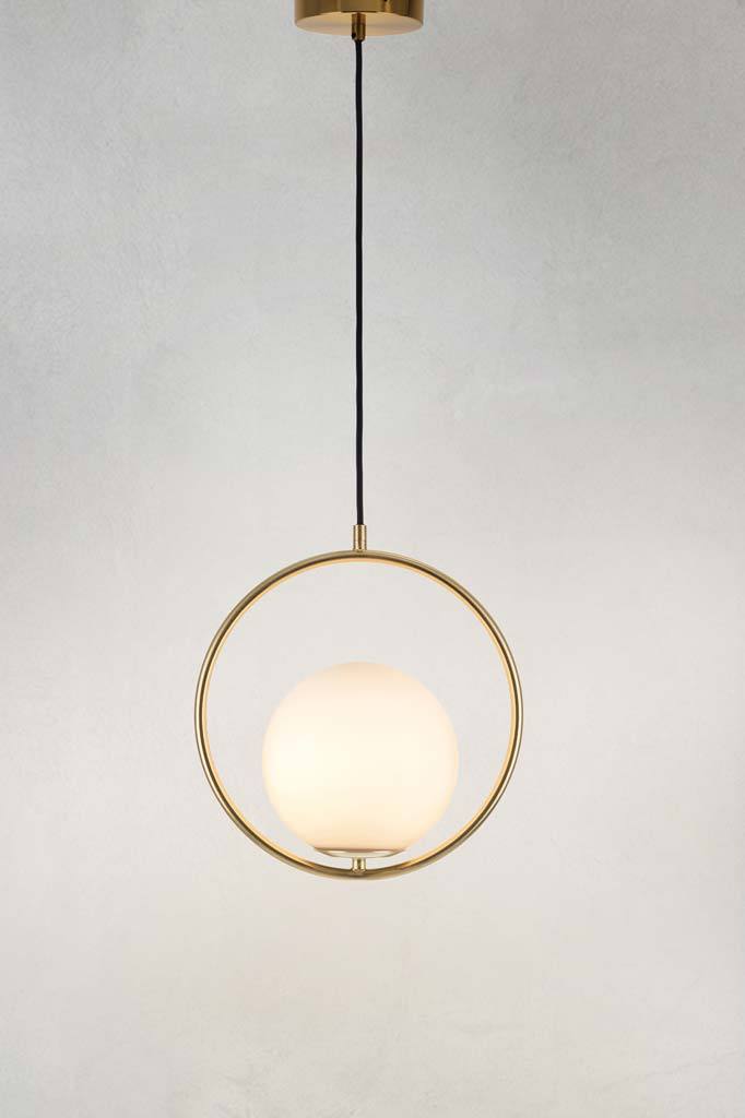 Bring a touch of retro charm from the 70s into your living spaces with the Bonnie Glass Sphere Pendant Light. Suspended by a circular metal frame that comes in brushed brass finish, the design showcases a 360 degree view of its opal glass ball shade. Its minimalist design allows this pendant to blend easily with a range of commercial and residential interiors including restaurants, day spas and guest rooms.