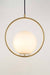 - The pendant light has a circular metal frame featuring an opal glass ball shade