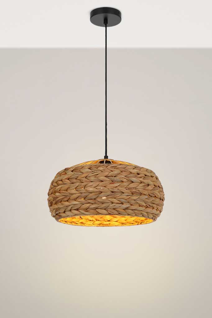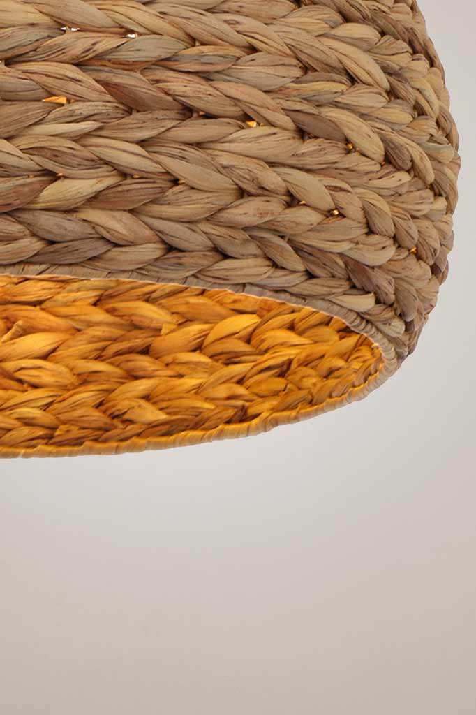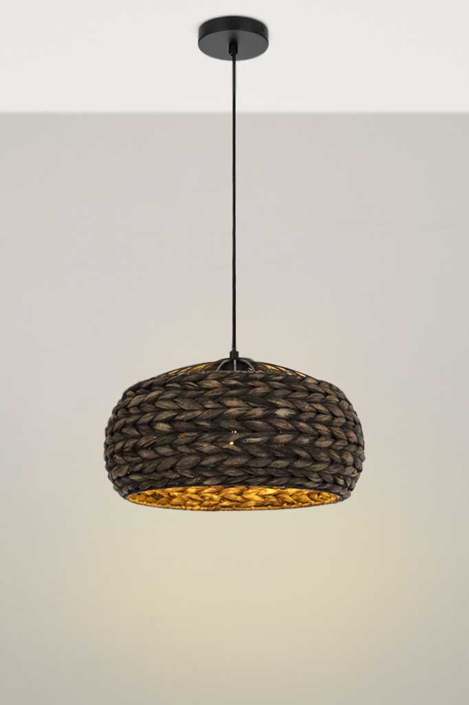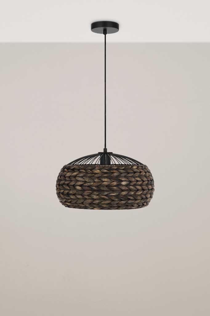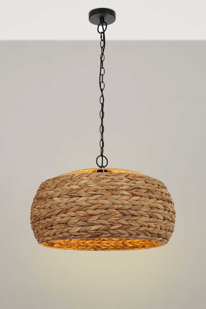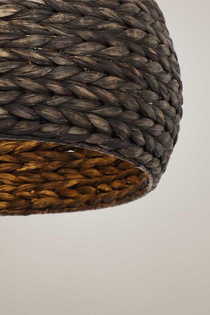 - The Botany Rope Pendant Light is woven from dried water hyacinth and accented with natural or black batons.